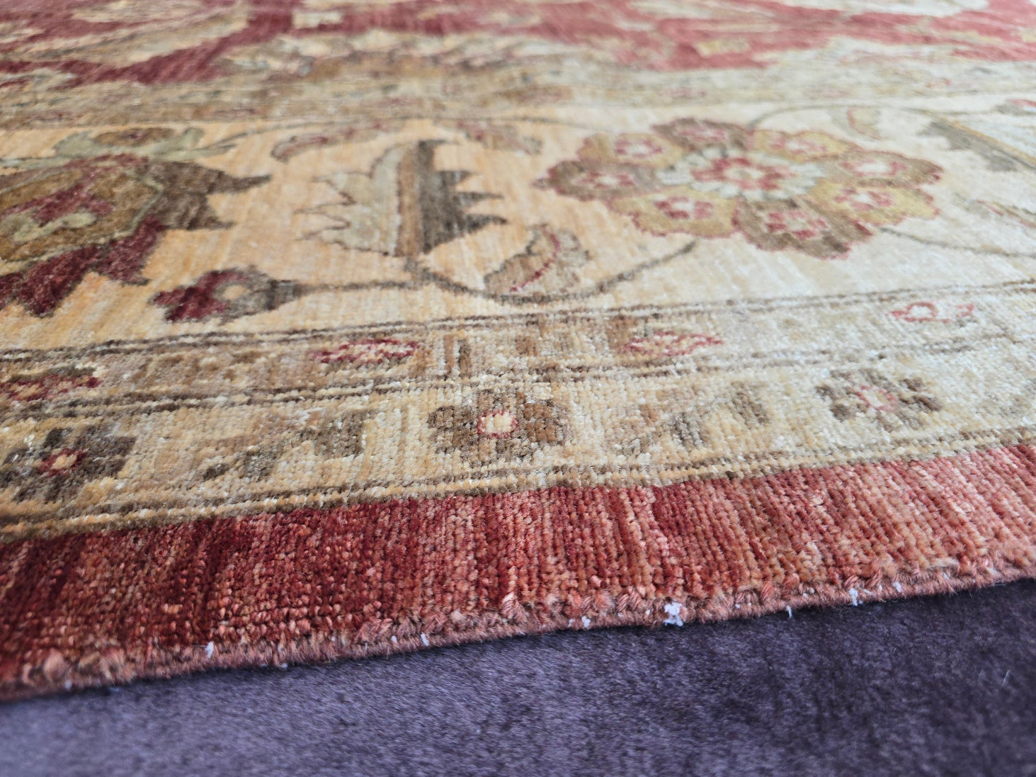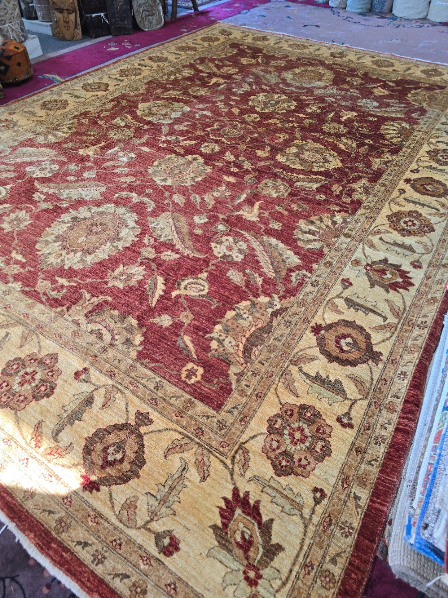 Elevate your space with this Afghan Traditional Teawash Rug, a beautiful blend of classic design and rich, warm hues. Measuring 10 x 14 feet, this hand-knotted masterpiece showcases a striking burgundy red field adorned with intricate floral motifs and scrolling vines, framed by a soft golden border. The teawash finish gives the rug a subtle aged patina, enhancing its depth and vintage appeal.