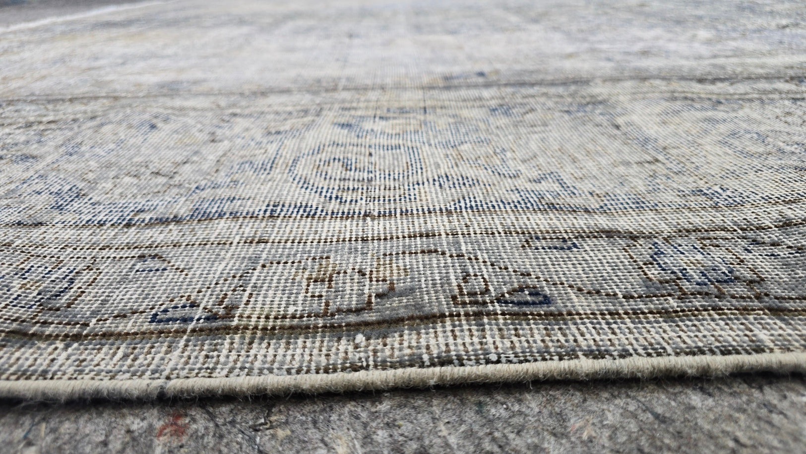 Experience the serene elegance of a distressed overdyed Persian rug that radiates timeless sophistication. Measuring 9.8 x 12.3 feet, this expansive rug blends intricate traditional patterns with a soft, faded palette of blues, grays, and ivory. Its delicate floral motifs peek through the artfully worn finish, creating a subtle yet captivating statement piece for your home.