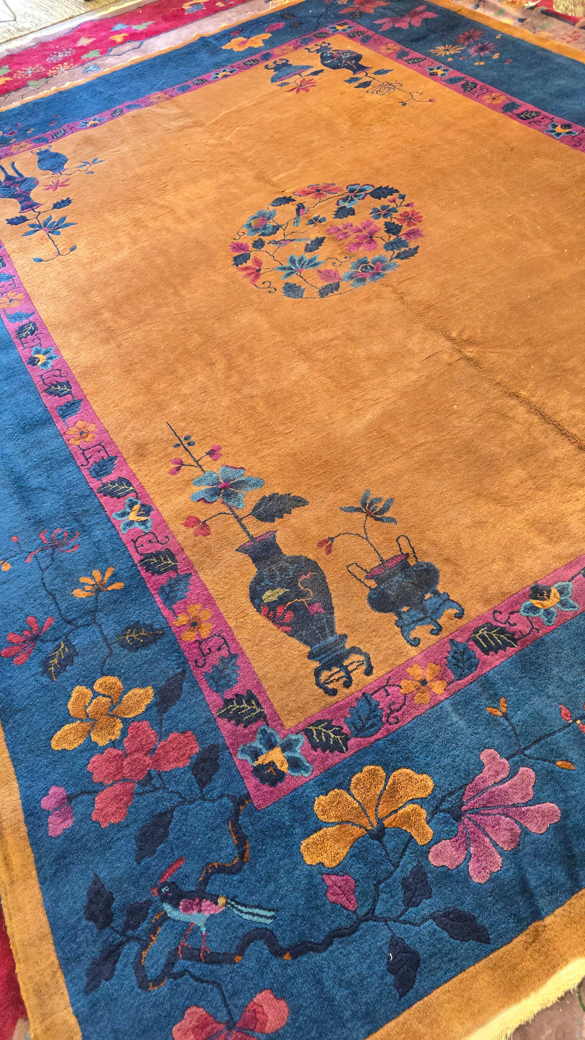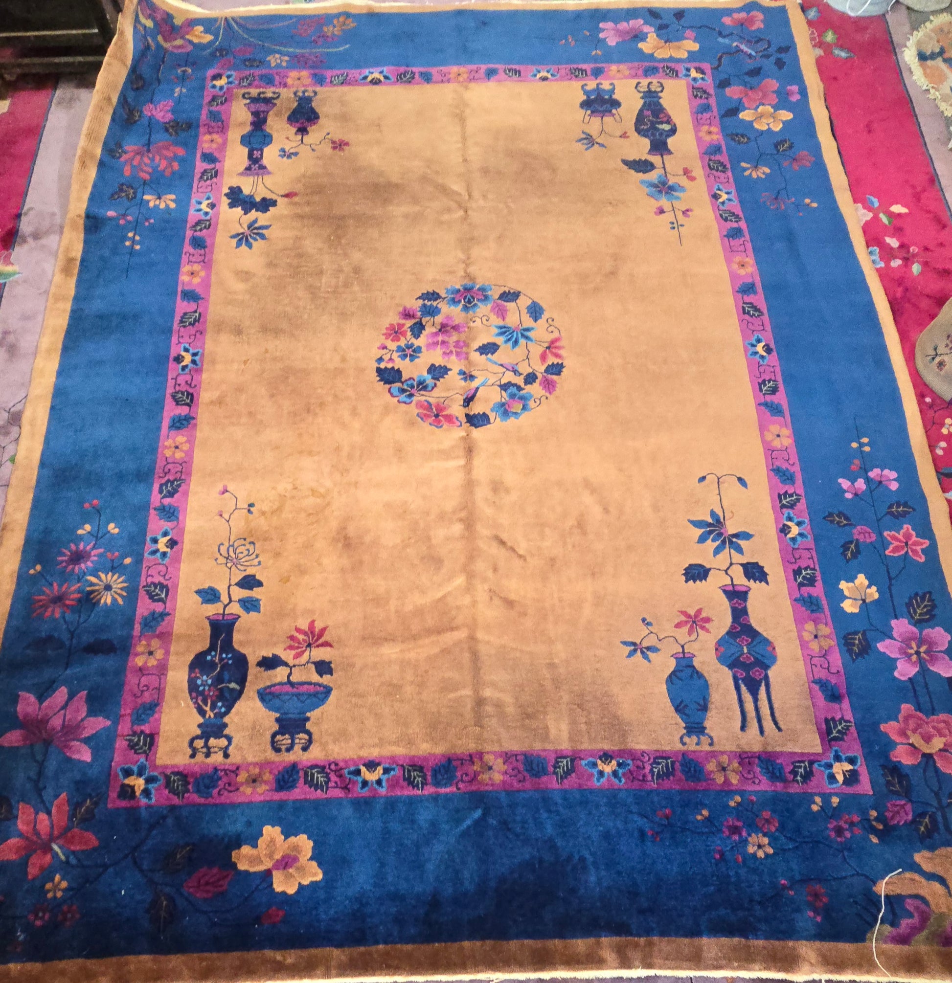 The most recognizable rugs from the 1920s and 1930s are Chinese Rugs made by Walter Nichols. These Nichols rugs, as they came to be known, were primarily made during the Art Deco movement in the early 20th Century. They were usually made of wool and silk and depicted floral designs in very rich, bold colors like magenta, turquoise, emerald, canary and ruby. They either had a very thick border or none at all. Nichols specialized in a mechanized wool spinning technique that produced a very thick strand - ideal for rugs. He was inspired by the works of many Art Deco artists and began to incorporate some classic deco motifs into his designs. Nichols rugs became wildly popular in the Art Deco era - they were luxurious and exotic - the epitome of Art Deco style.