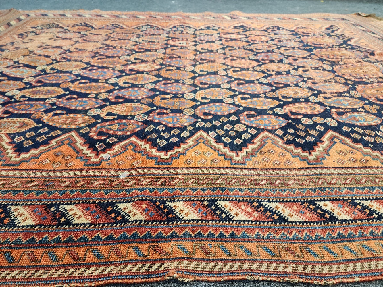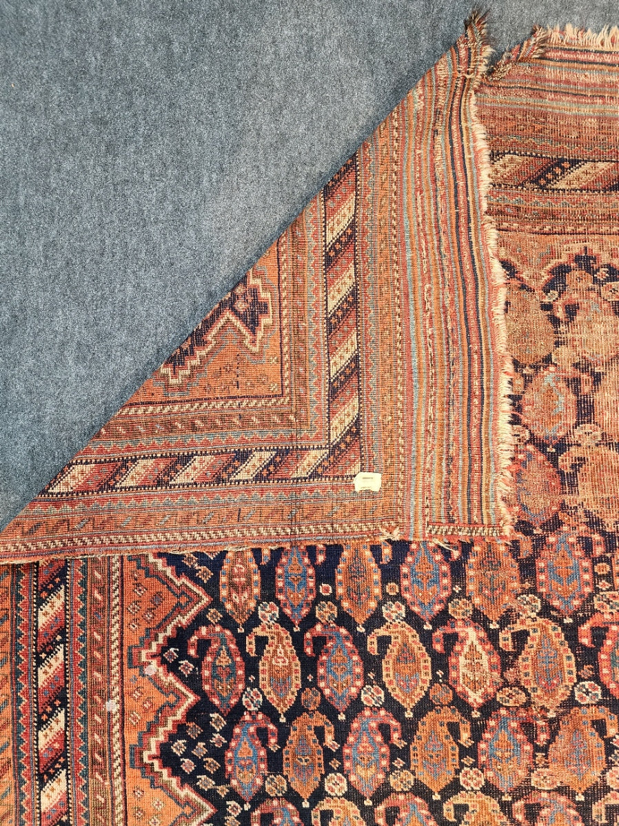 Experience the rich cultural heritage of Persia with this 19th Century Afshar rug, a rare and authentic tribal piece renowned for its bold geometric designs and vibrant color palette. Measuring 4.3 x 5.10 feet, this handwoven wool rug features a striking diamond lattice pattern filled with intricate boteh (paisley) and floral motifs, framed by dynamic borders. The deep indigo, rust, and terracotta hues reflect the traditional artistry of the Afshar nomadic weavers.