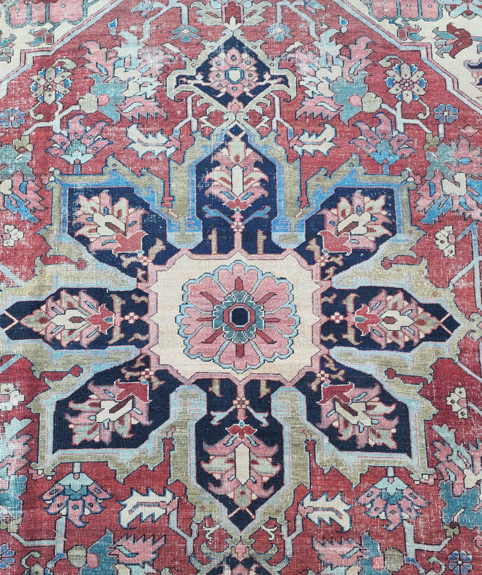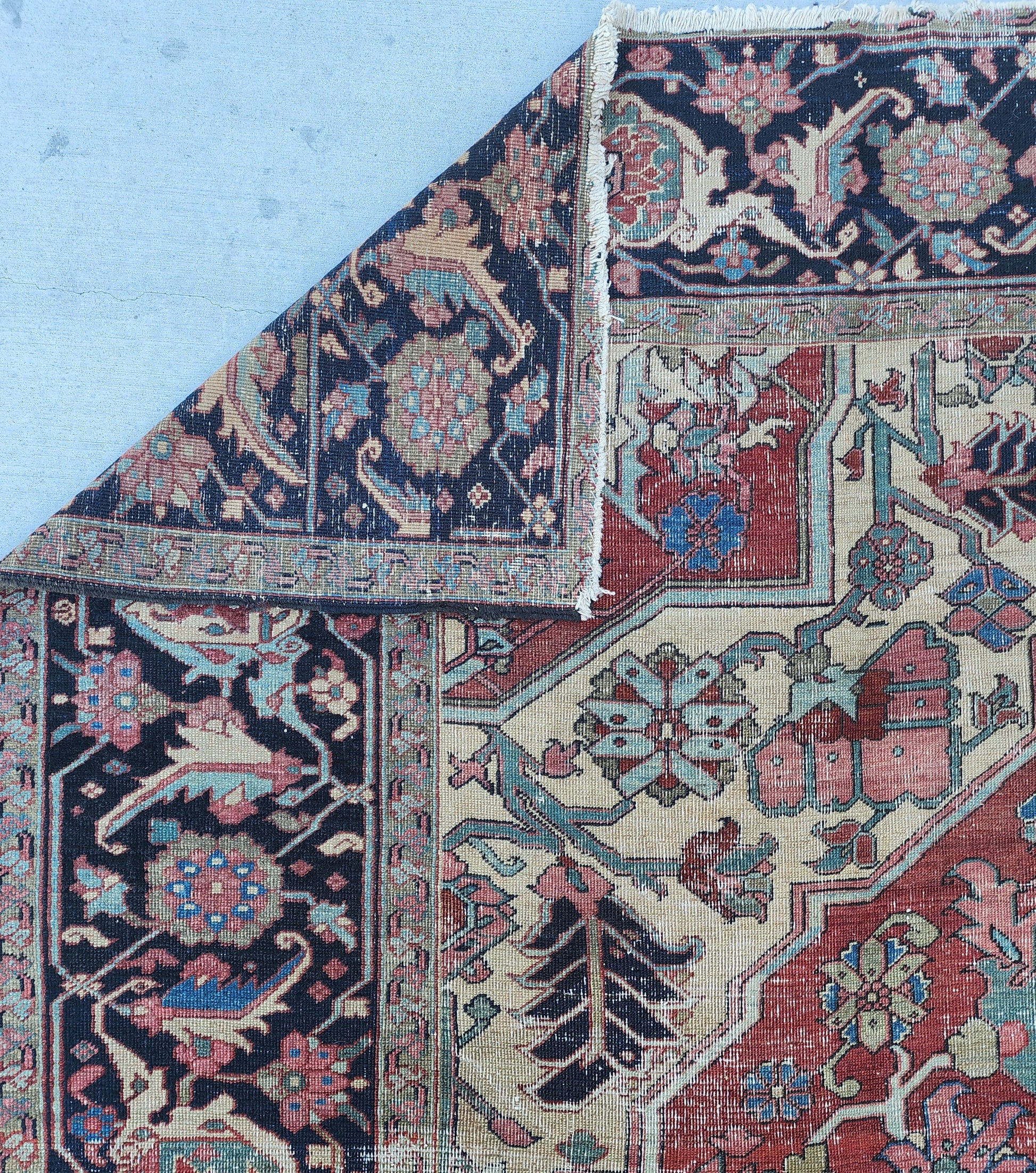Serapi rugs, originating from the Heriz region of Persia (modern-day Iran), are celebrated for their bold geometric patterns and exquisite craftsmanship. This rug features a large medallion with angular floral motifs, framed by an elaborate midnight blue border adorned with rosettes and palmettes. The corner spandrels showcase detailed botanical motifs, creating a balanced and symmetrical design that reflects the artistry of 19th-century Persian weavers.