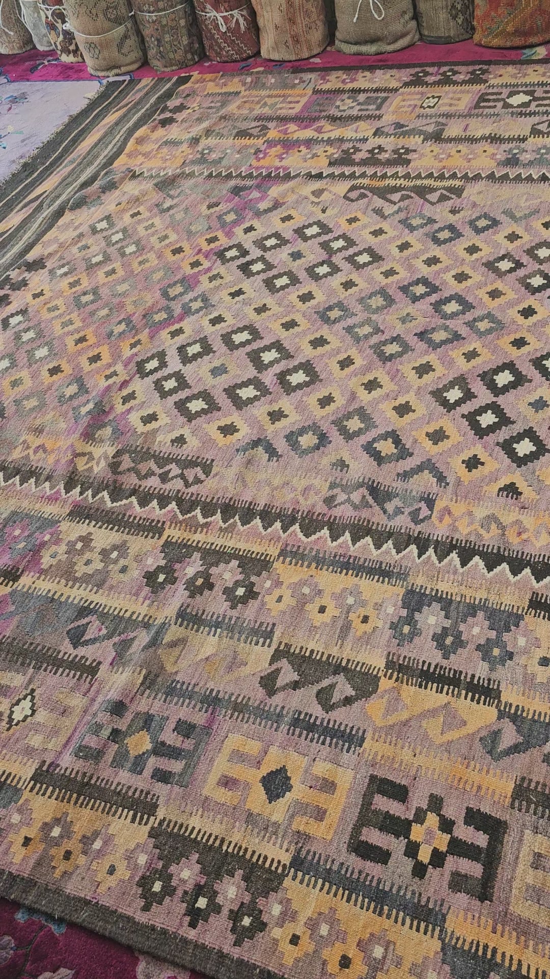 This Maimana Kilim is a striking example of Afghan tribal artistry, showcasing a bold geometric design infused with cultural symbolism. Measuring 10 x 16 feet, this handwoven flatweave rug features intricate diamond and lattice motifsin earthy tones of soft lavender, black, beige, and muted yellow, reflecting the natural dyes used by skilled artisans.