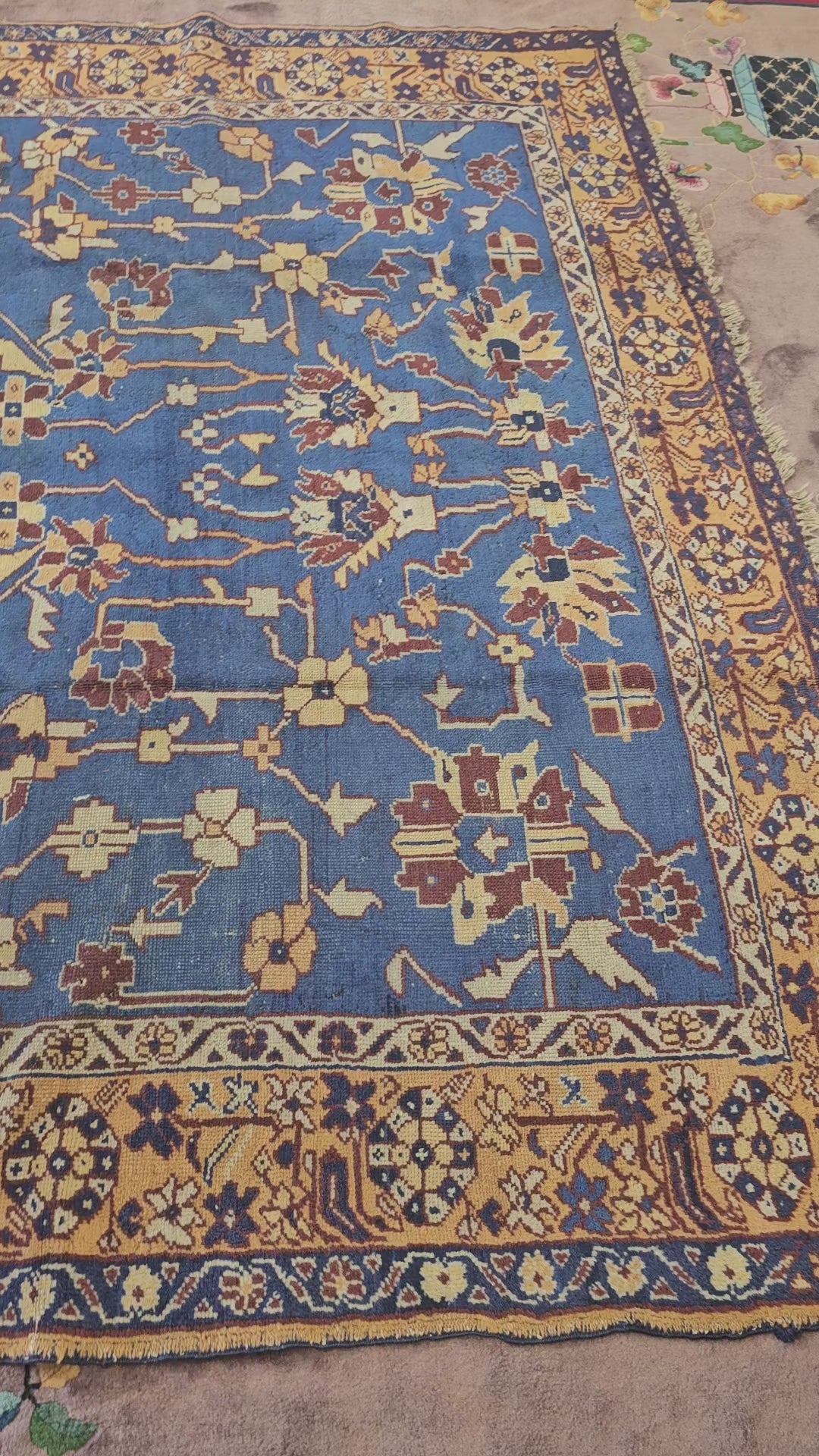 Handwoven by artisans in Oushak, Turkey, this rug showcases the region’s signature style – large-scale floral designs, soft color palettes, and plush textures. The use of a vibrant blue field, rarely seen in Oushak rugs of this period, makes this piece exceptionally unique and valuable. The design reflects traditional Ottoman influences, blending geometric and floral elements harmoniously.