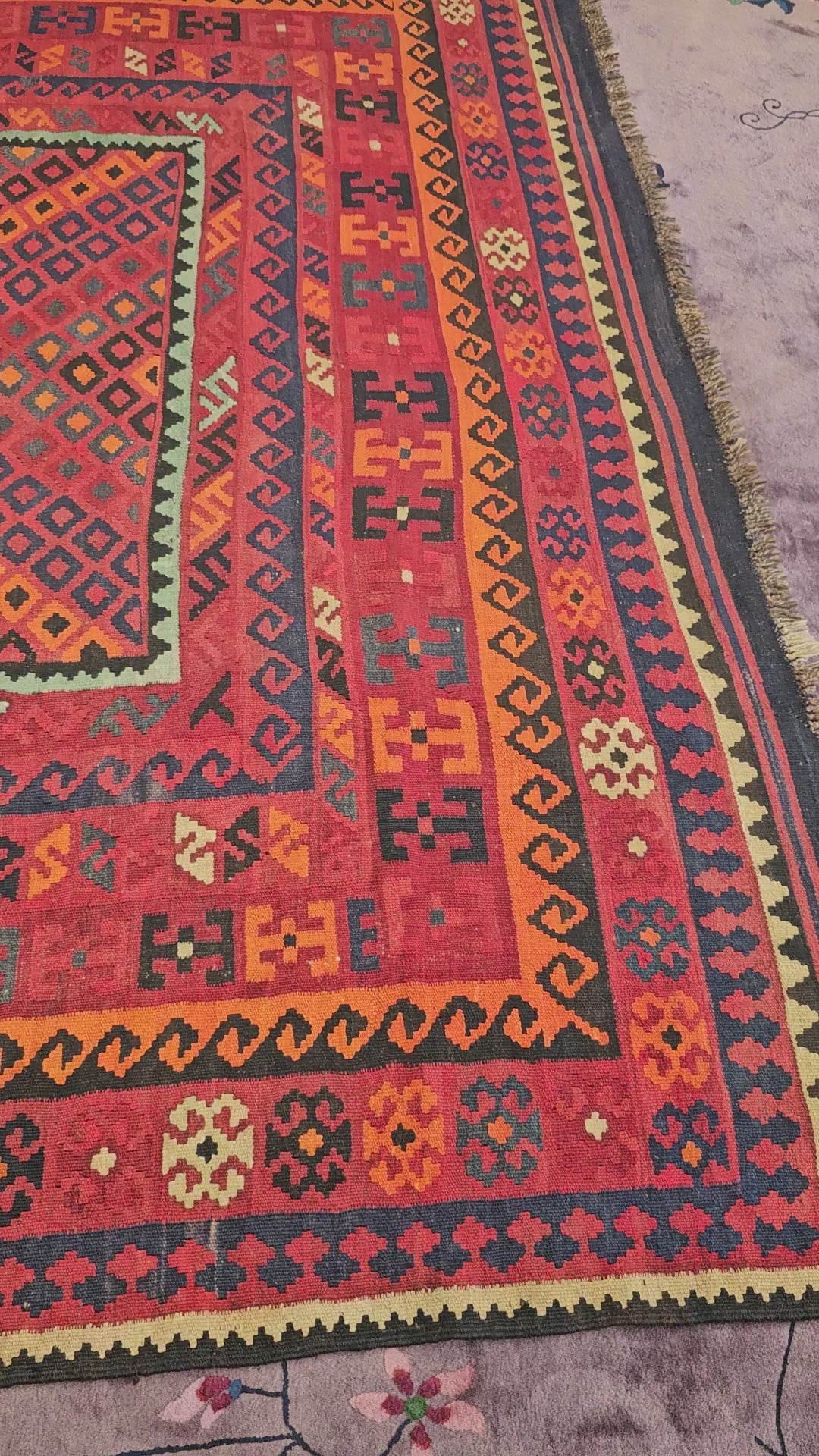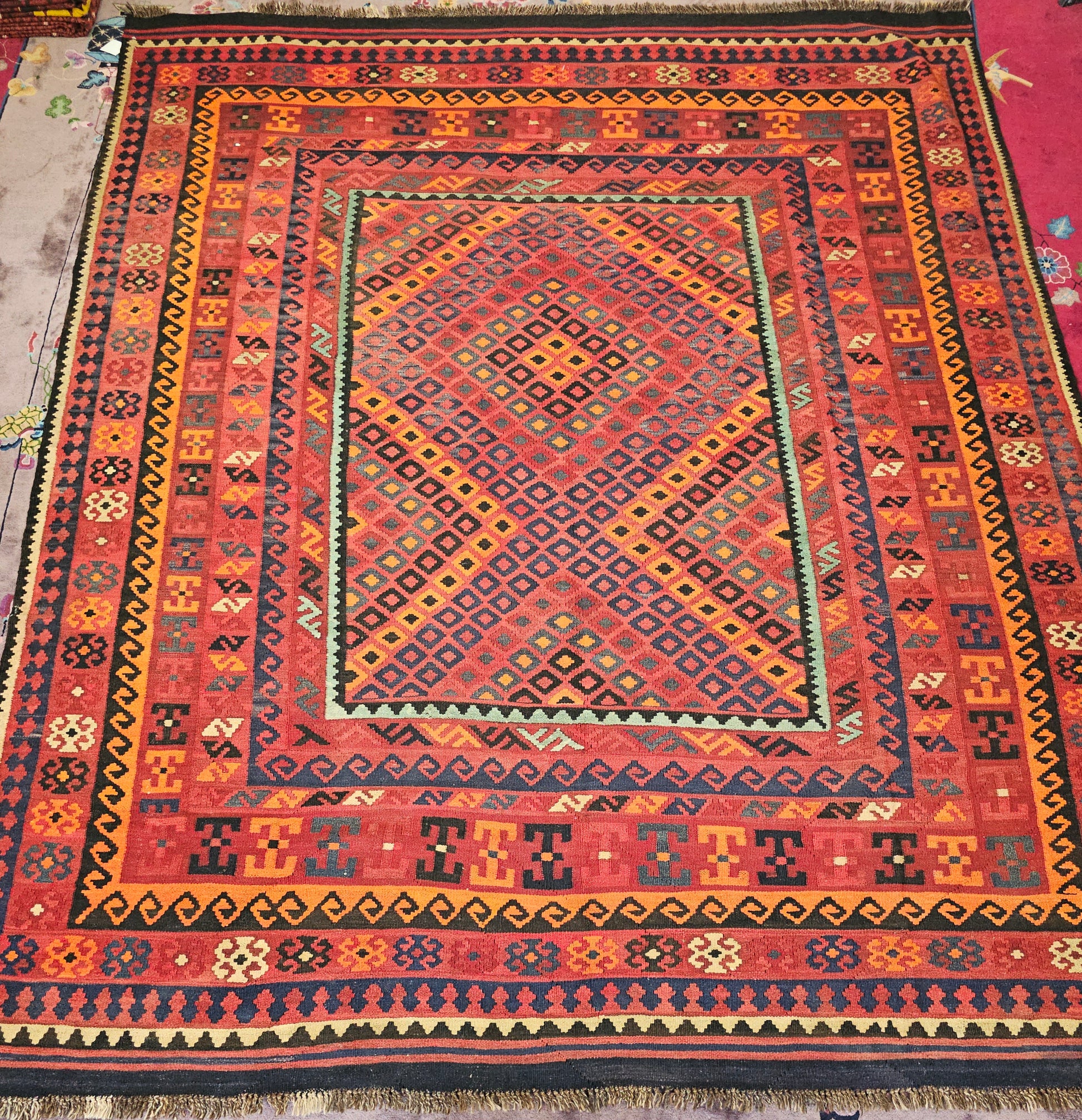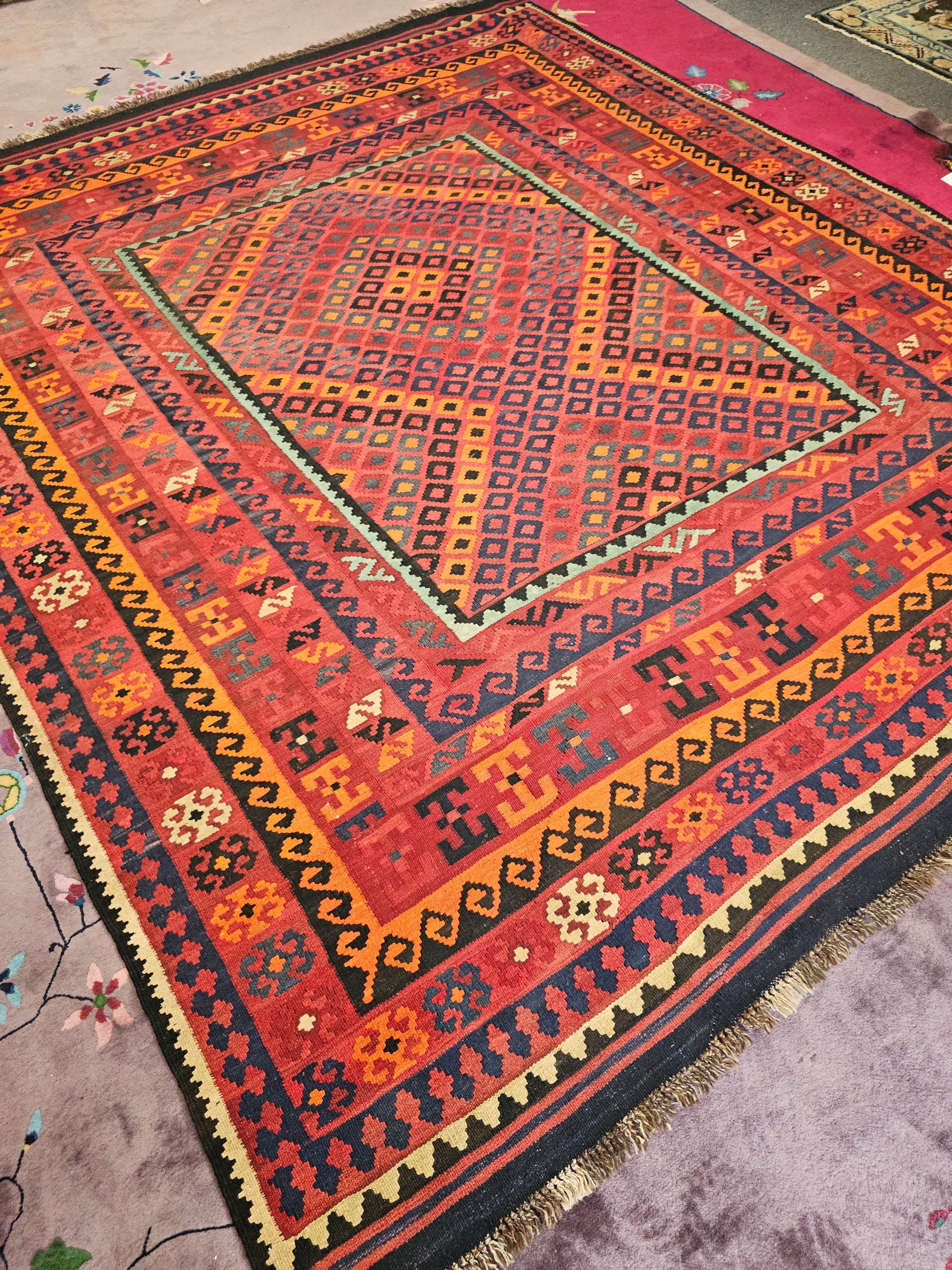 Bring timeless tribal beauty into your home with this large Afghan Maimana Kilim, a striking handwoven rug crafted from 100% wool. Measuring 7.8x11 ft, this exquisite kilim showcases a bold diamond lattice design in vibrant hues of red, orange, navy, and black, framed by intricate multi-band borders.