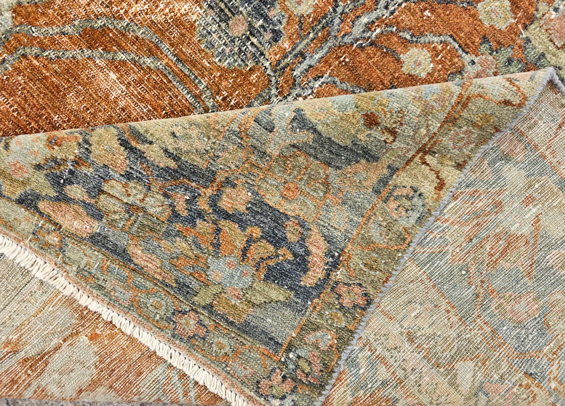 Originating from the Lilihan region of Persia (modern-day Iran), this rug features a richly decorative floral designwith symmetrical arrangements of vines, palmettes, and blossoms. The rug's rust-orange field is contrasted by intricate sky-blue and ivory floral accents, framed by a classic navy and beige border. This balanced composition embodies the grace and tradition of Persian rugs, while the subtle distressed patina enhances its antique appeal.