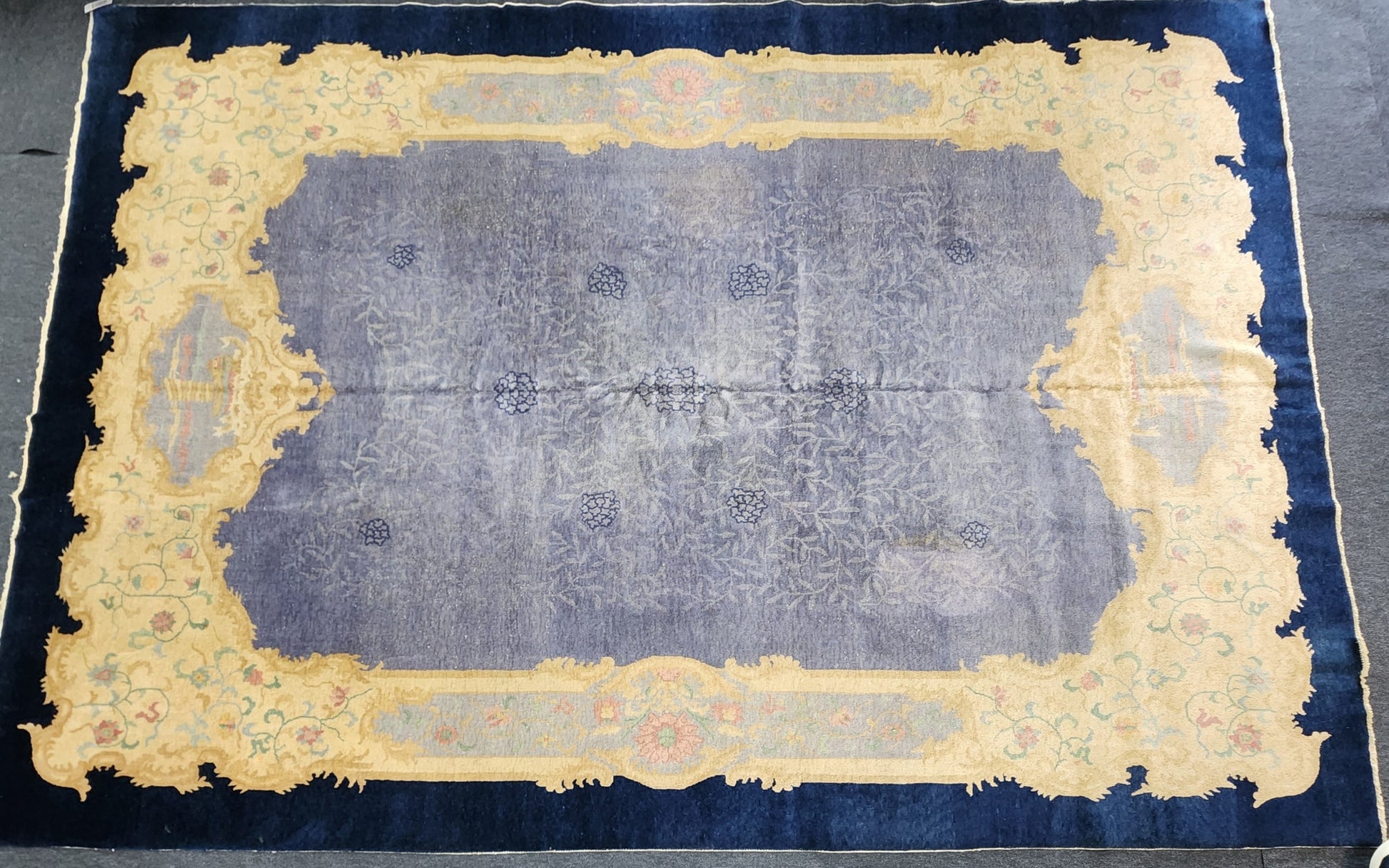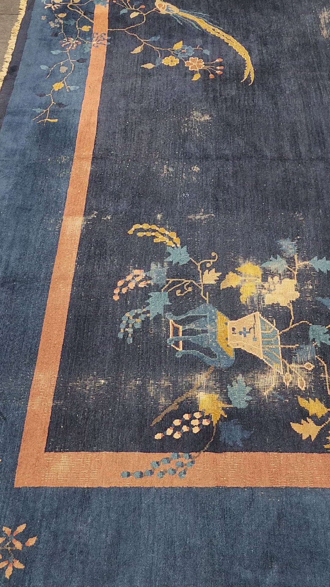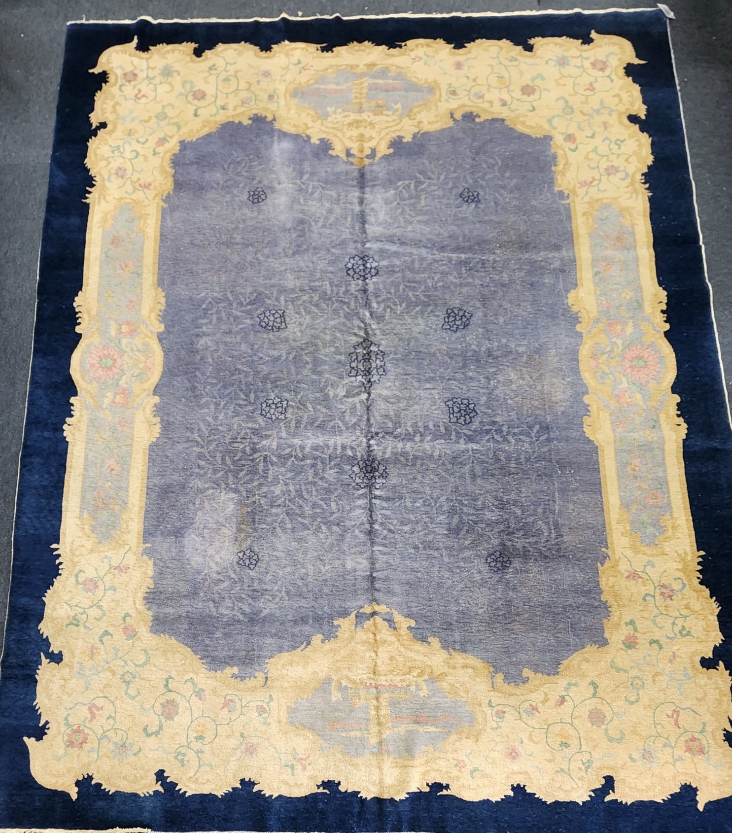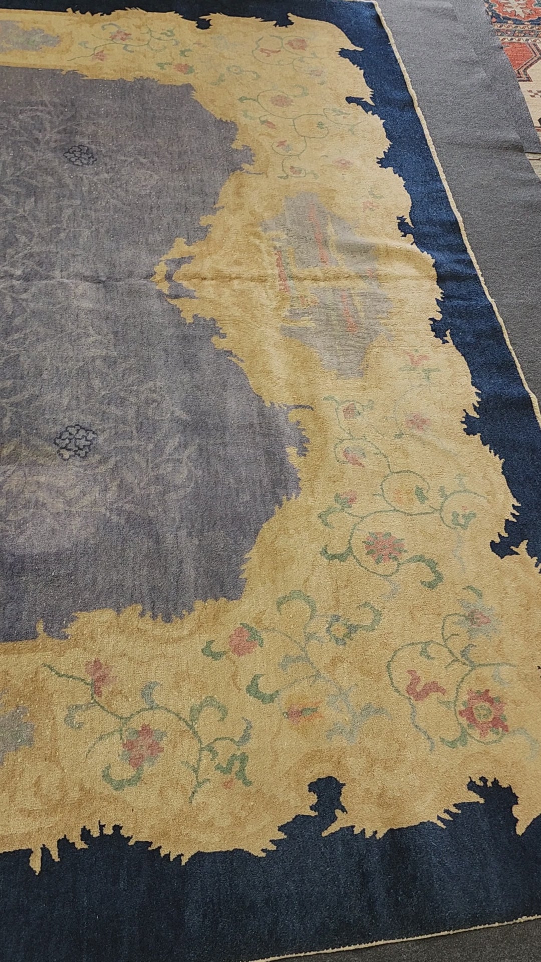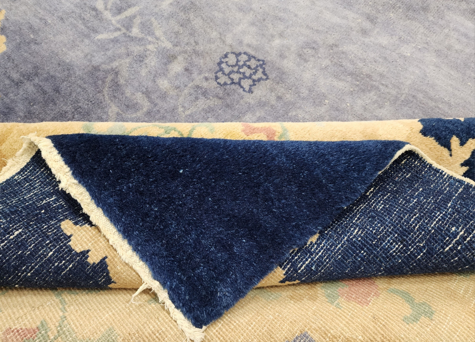 Step into the elegance of early 20th-century design with this Antique Chinese Fette Rug, a sophisticated blend of Art Deco influence and traditional Chinese craftsmanship. Measuring 9 x 12 feet, this stunning rug features a soft blue fieldwith delicate floral patterns, framed by a lavish gold and navy border.