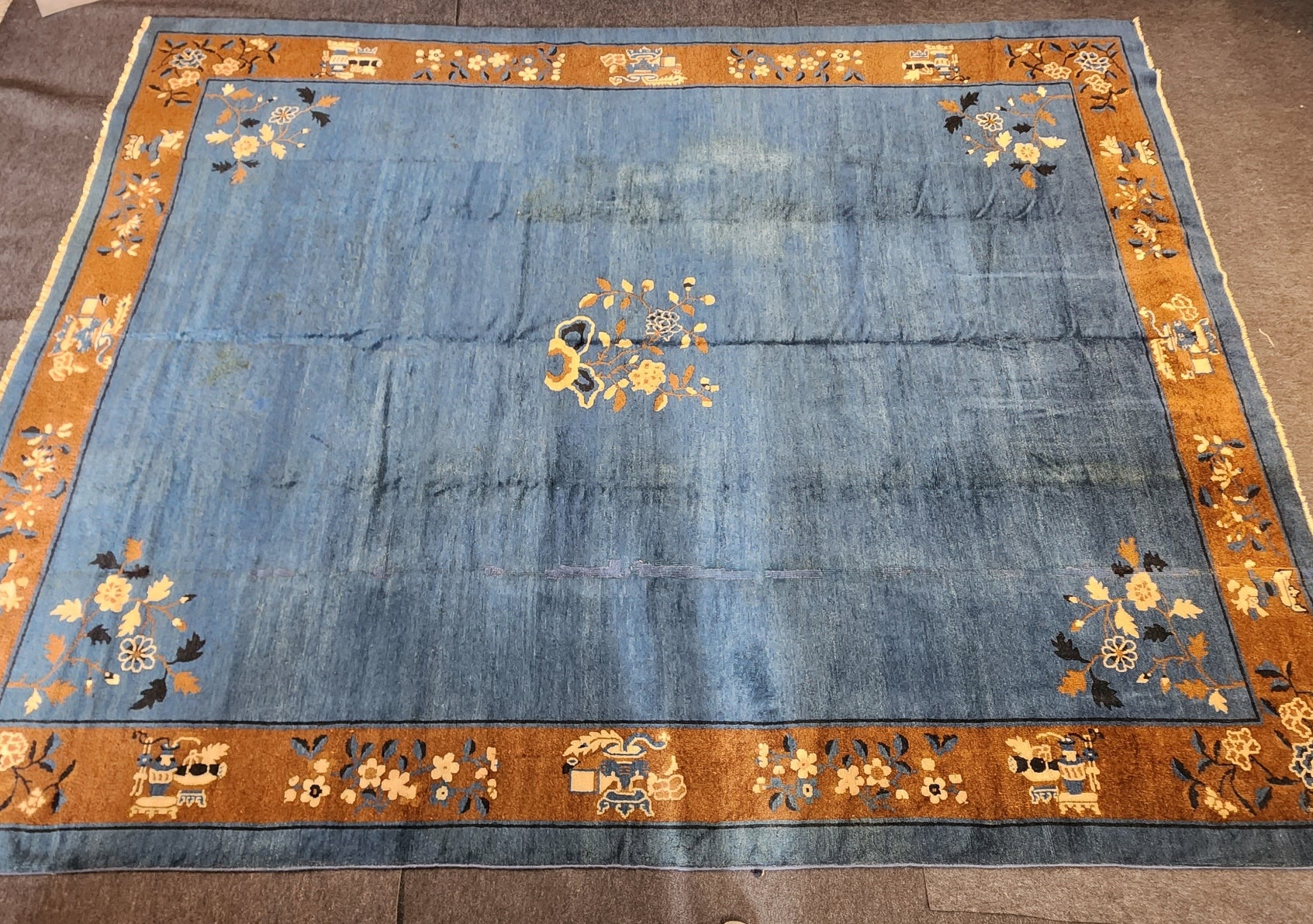 Add a touch of timeless elegance to your space with this Antique Chinese Peking Rug, a luxurious handwoven piece from the early 20th century. Measuring 9 x 12 feet, this stunning rug features a deep indigo blue field adorned with delicate floral sprays and symbolic motifs at the center, framed by a rich burnt orange border embellished with intricate vase, dragon, and floral designs.