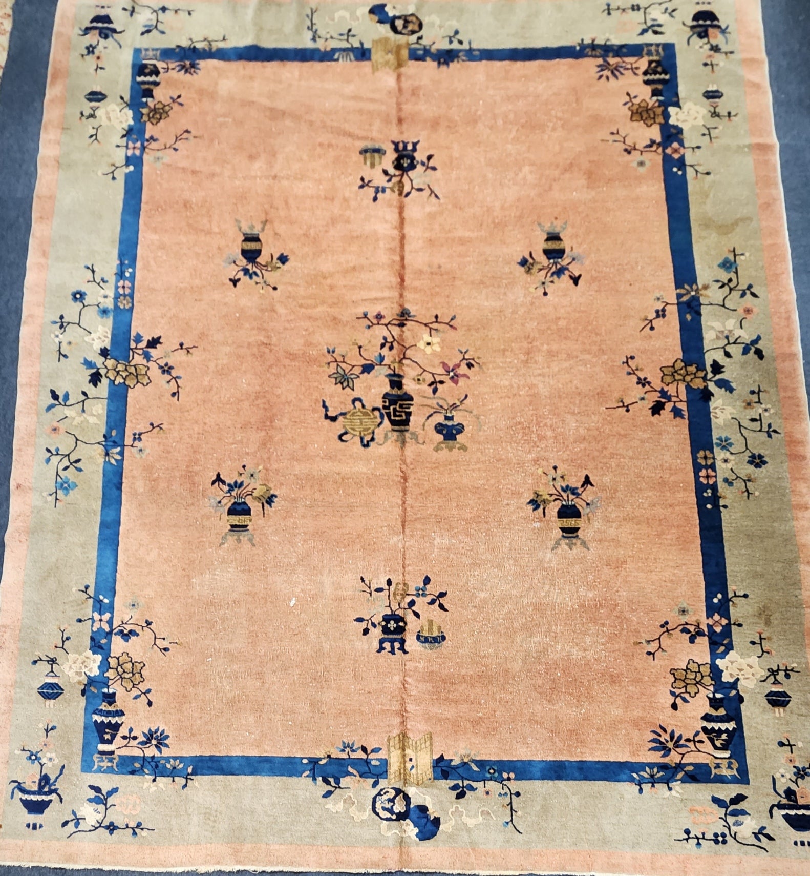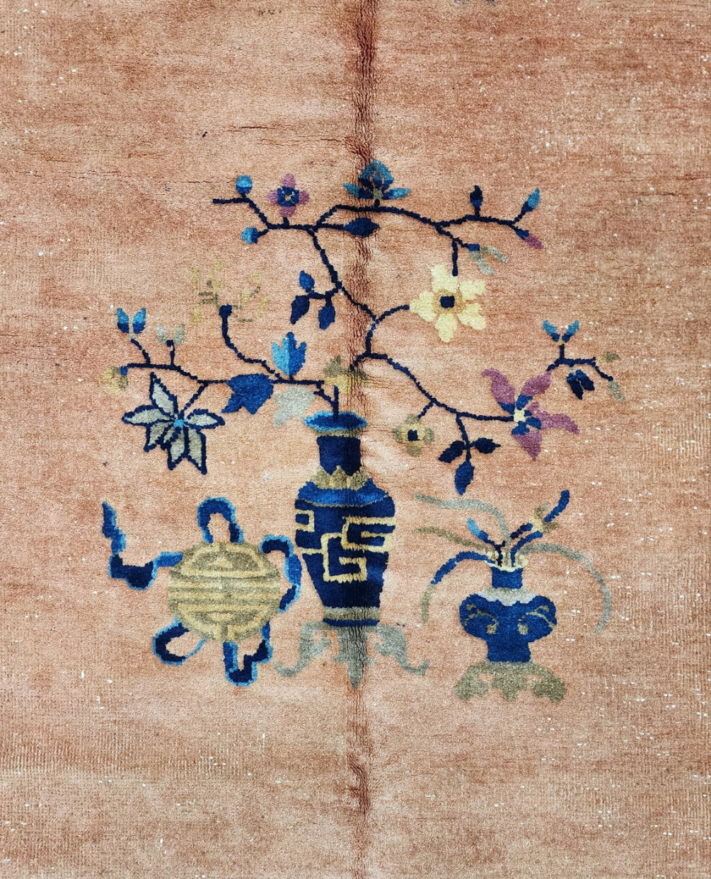 The rug features a soft blush field adorned with delicate floral and vase motifs, framed by a striking deep blue and ivory border. The minimal yet sophisticated design highlights the elegance and symmetry characteristic of Peking rugs, known for their sparse yet meaningful ornamentation. The intricate botanical patterns, symbolic of prosperity and longevity, are rendered with exceptional precision, embodying the rich cultural heritage of Chinese textile art.
