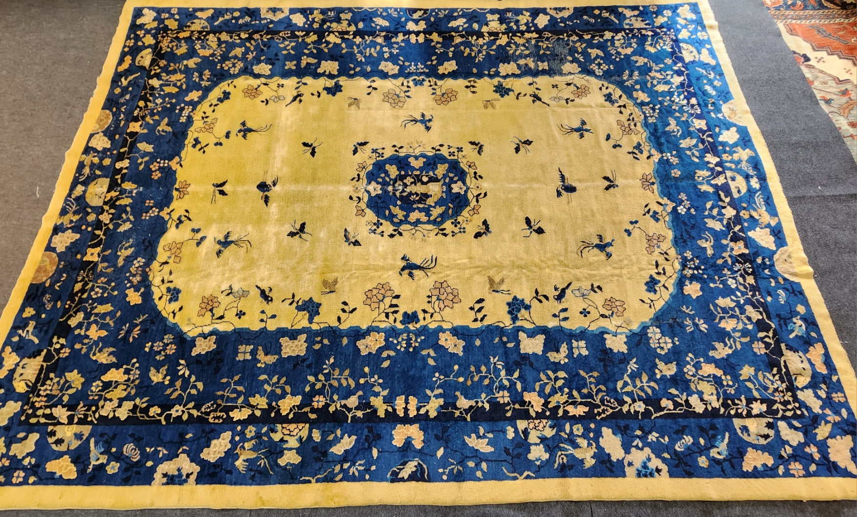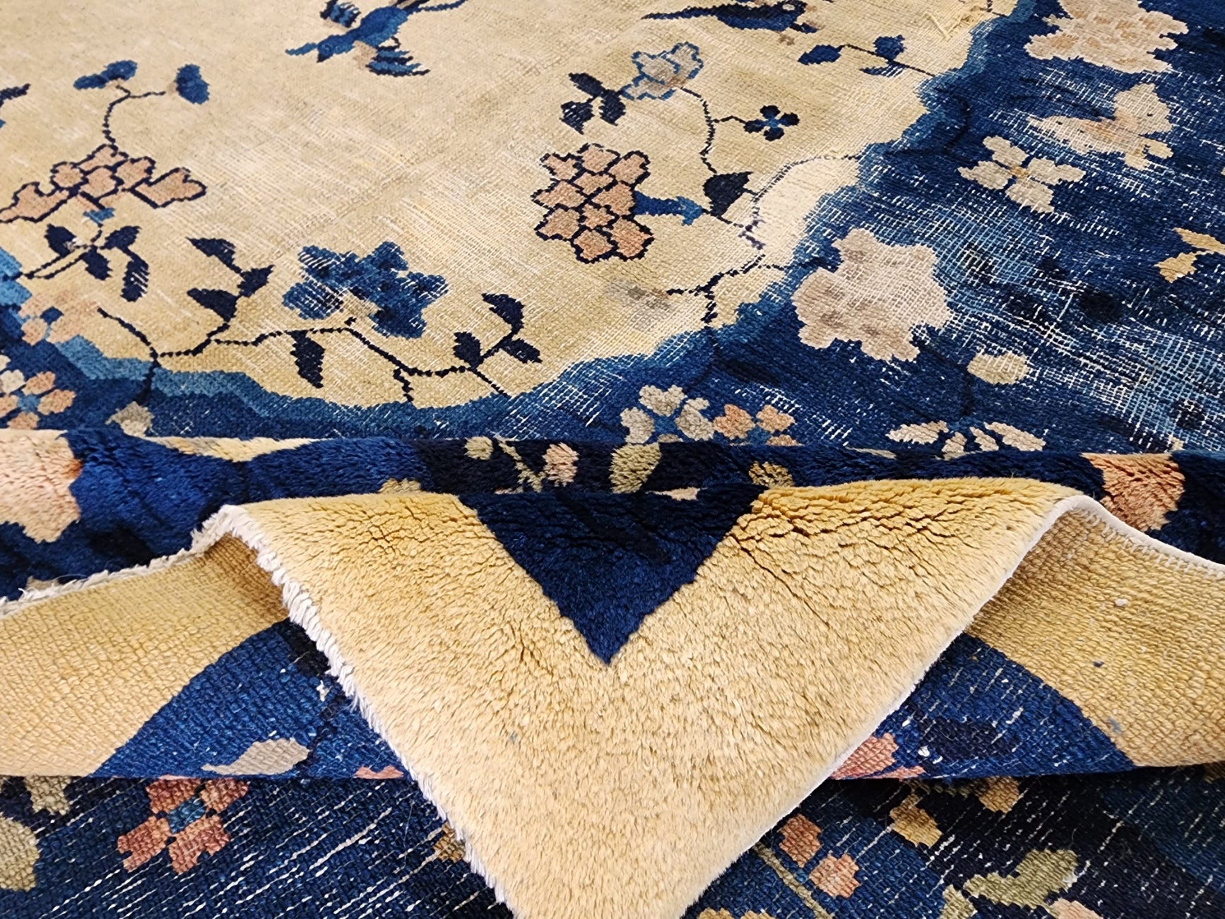 Introduce timeless elegance to your space with this Antique Chinese Peking Rug, a captivating piece of early 20th-century craftsmanship. Measuring 9 x 12 feet, this handwoven rug features a striking golden field encased by an ornate deep indigo border, adorned with delicate floral sprays, birds, and butterflies – motifs symbolizing harmony, prosperity, and nature.