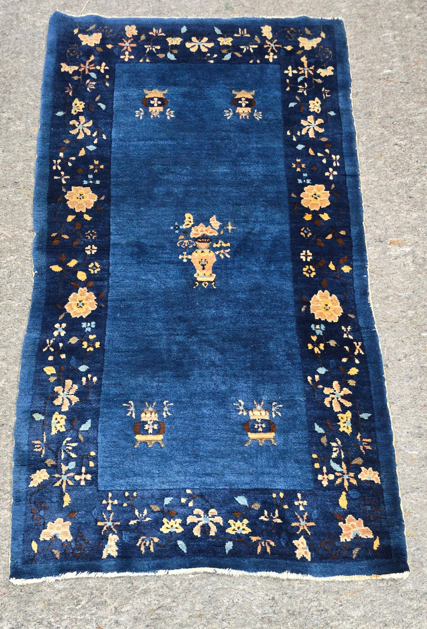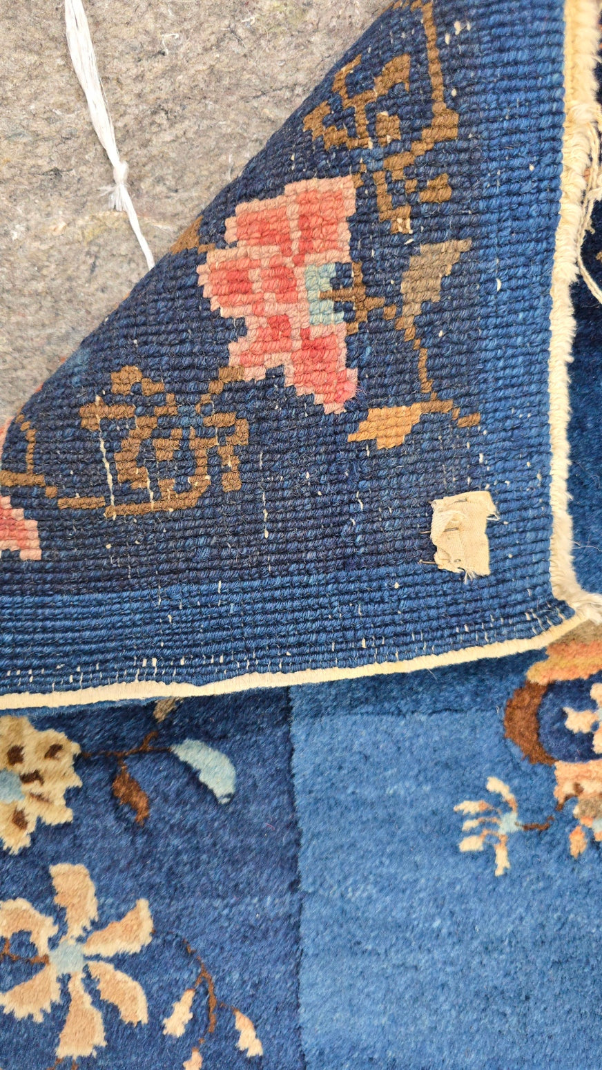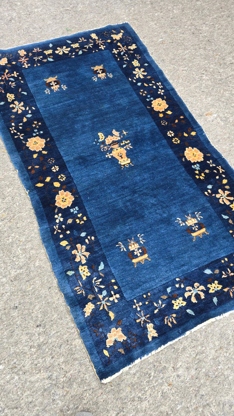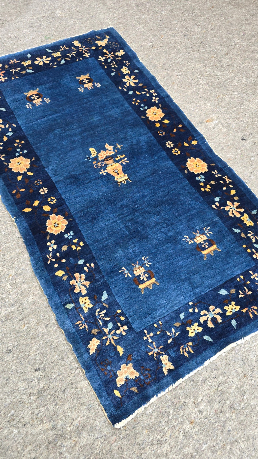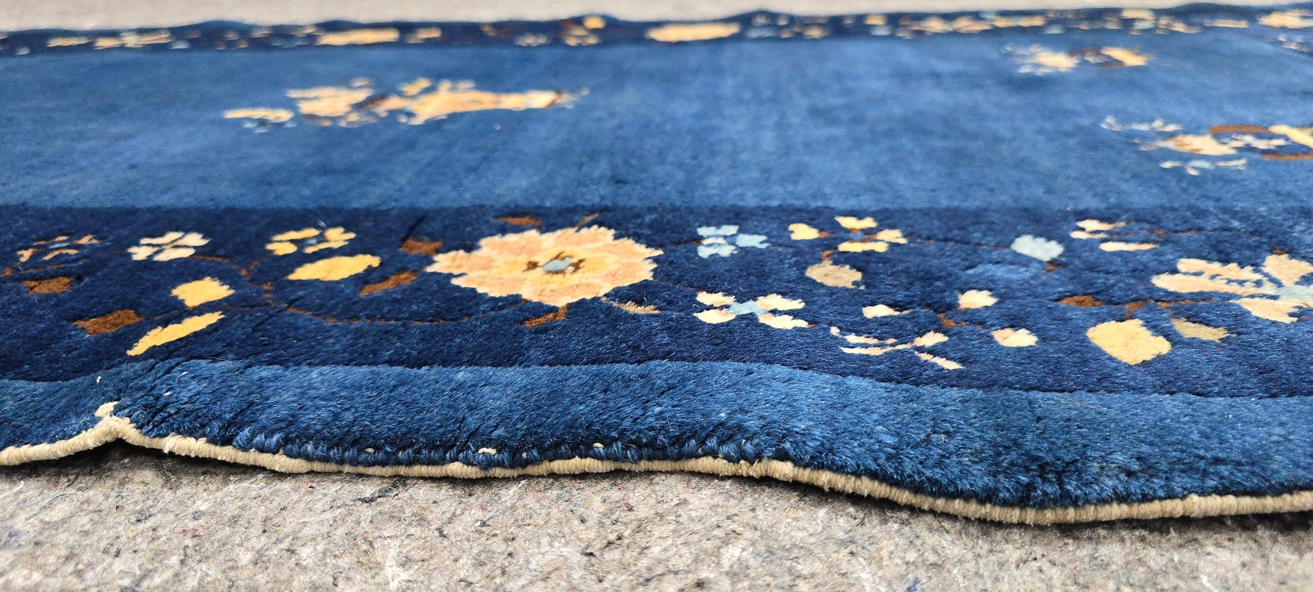 Add a touch of timeless elegance to your space with this Antique Chinese Peking Rug, a luxurious handwoven piece from the early 20th century. Measuring 3.2 x 5.9 feet, this stunning rug features a deep indigo blue field adorned with delicate floral sprays and symbolic motifs at the center, framed by a rich Floral border embellished with intricate vase, dragon, and floral designs.