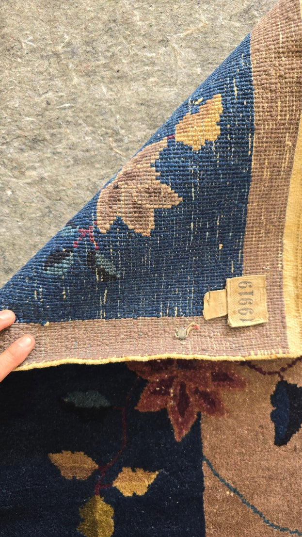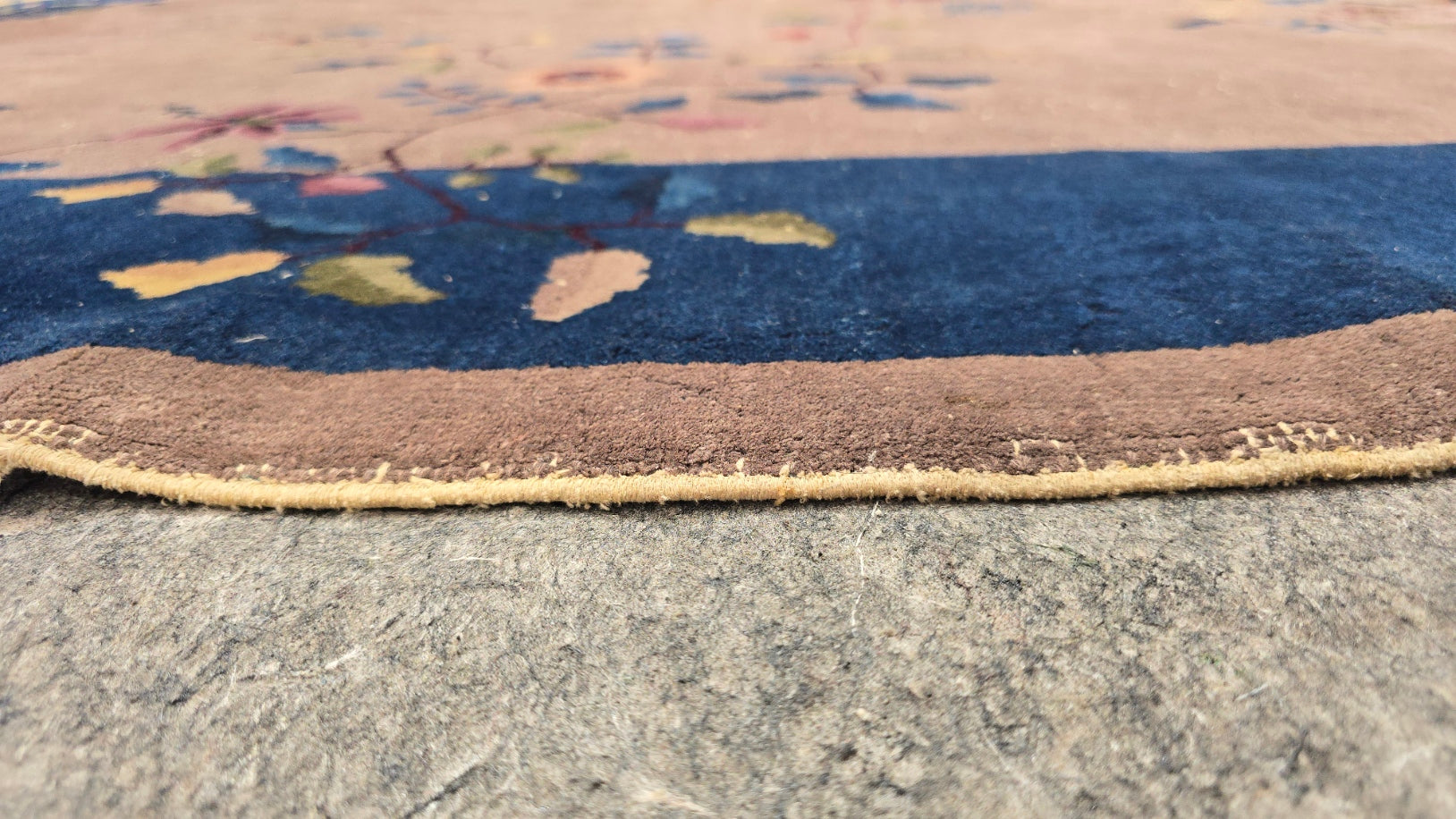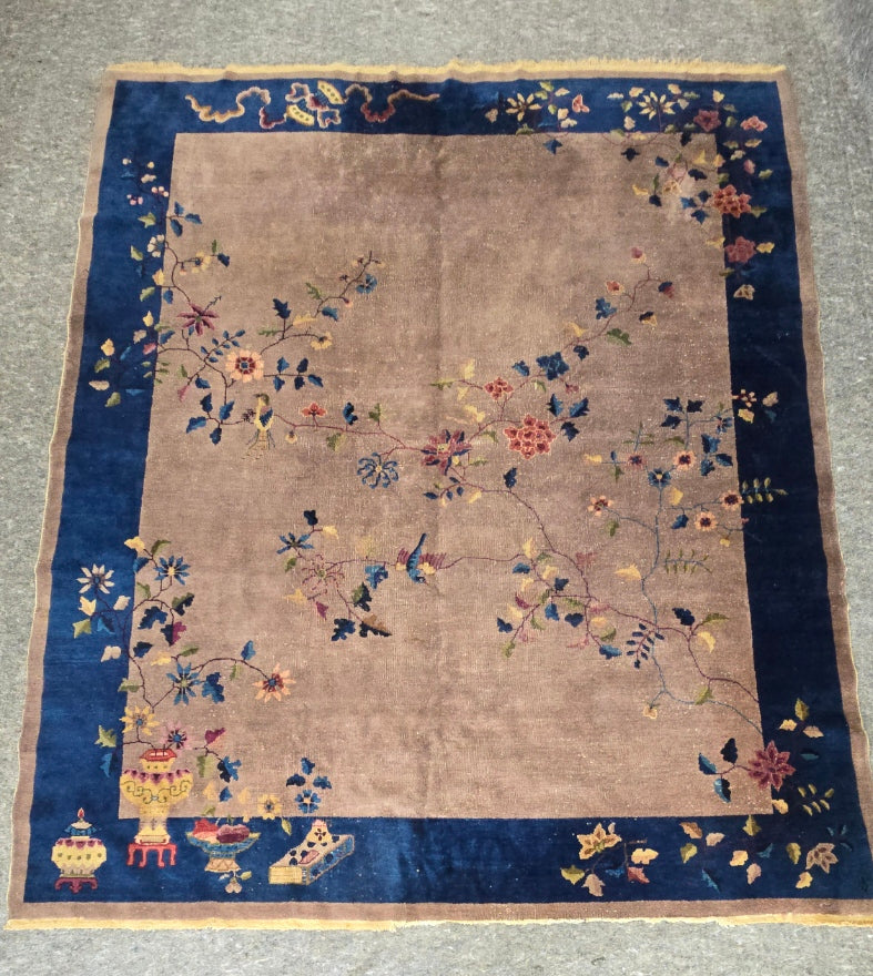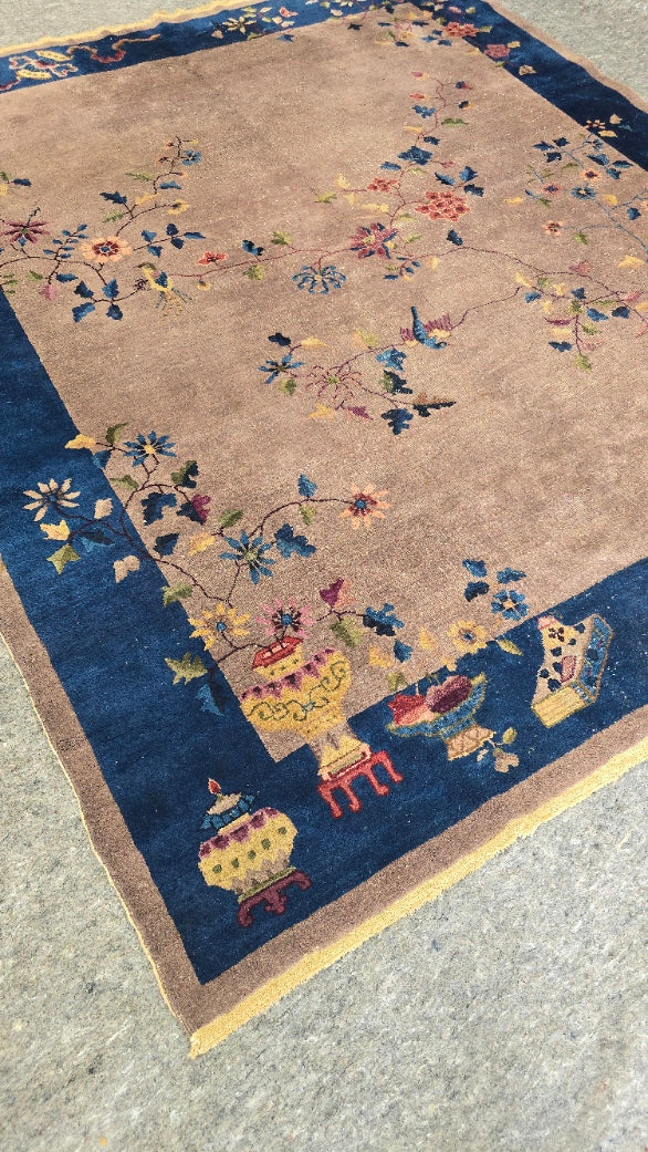 This Antique Chinese Peking Rug, crafted in the early 20th century, reflects the elegance and artistry of traditional Chinese weaving. Measuring 8 x 10 feet, this hand-knotted masterpiece features a soft ivory field adorned with subtle floral sprays, a central vase motif, and delicate medallions. The intricate deep blue border highlights symbols of prosperity, vases, and floral elements, creating a stunning contrast that enhances its timeless appeal.