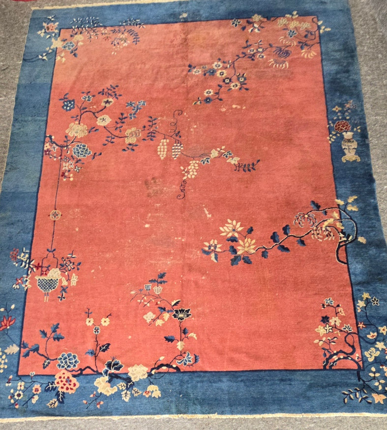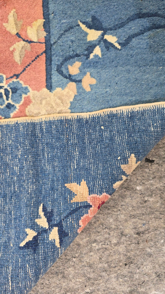 This Antique Chinese Peking Rug, crafted in the early 20th century, reflects the elegance and artistry of traditional Chinese weaving. Measuring 9 x 11.8 feet, this hand-knotted masterpiece features a soft ivory field adorned with subtle floral sprays, a central vase motif, and delicate medallions. The intricate deep blue border highlights symbols of prosperity, vases, and floral elements, creating a stunning contrast that enhances its timeless appeal.
