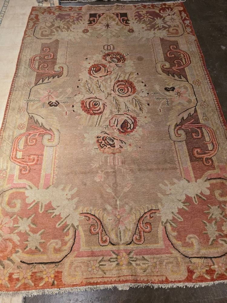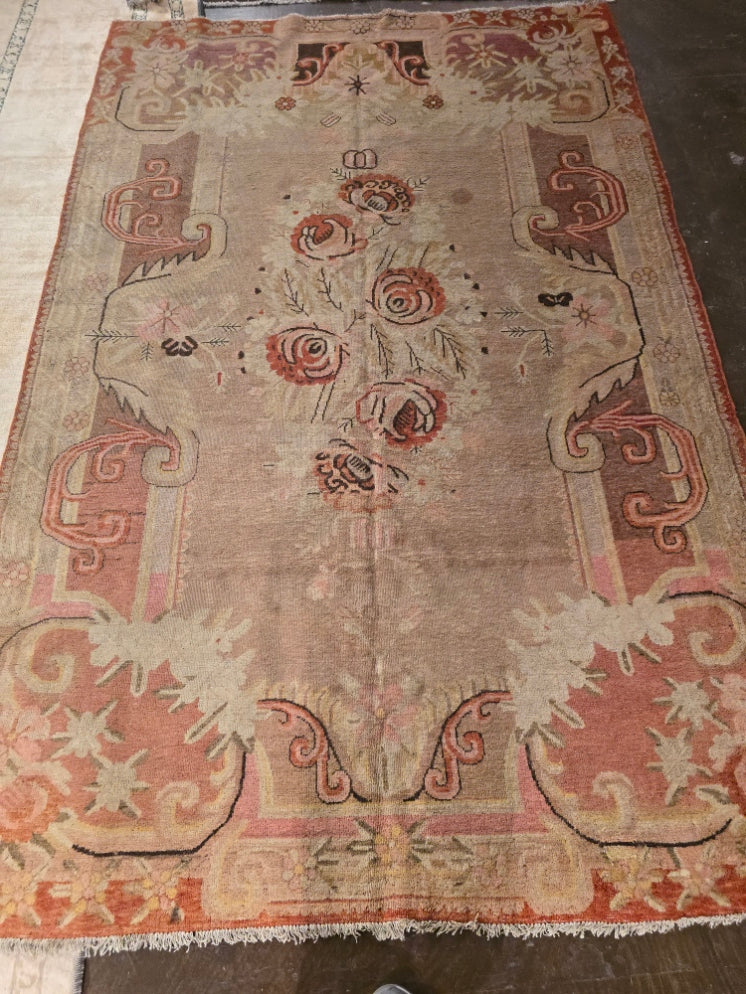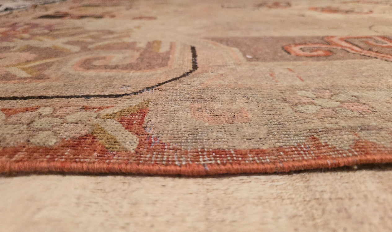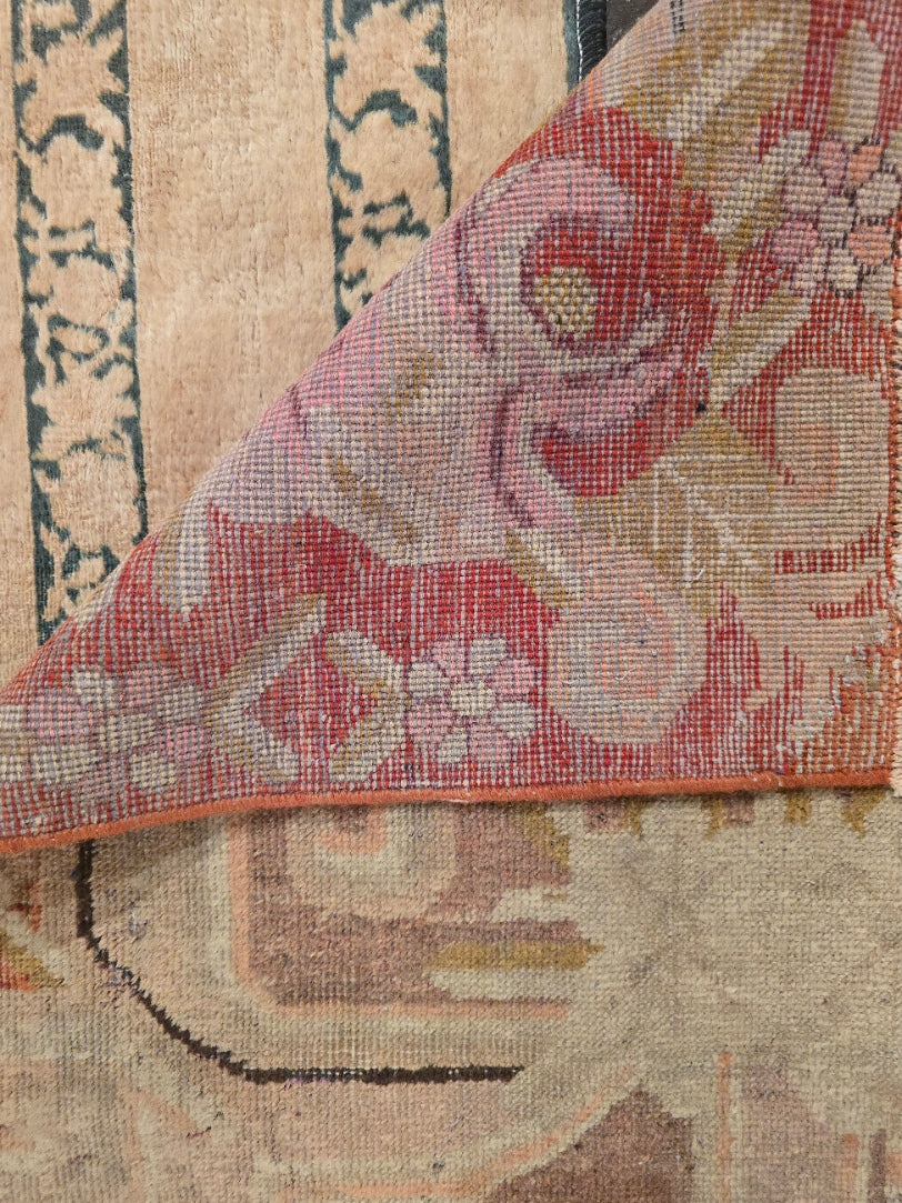 Khotan rugs hail from the Samarkand region of East Turkestan (modern-day Xinjiang), known for producing elegant, long runners featuring a fusion of Chinese, Persian, and Central Asian design influences. Their soft color palettes and intricate medallion patterns make them particularly sought after by collectors and interior designers. This rug’s faded patina and warm pink hues reflect the passage of time, adding authenticity and character to any space.