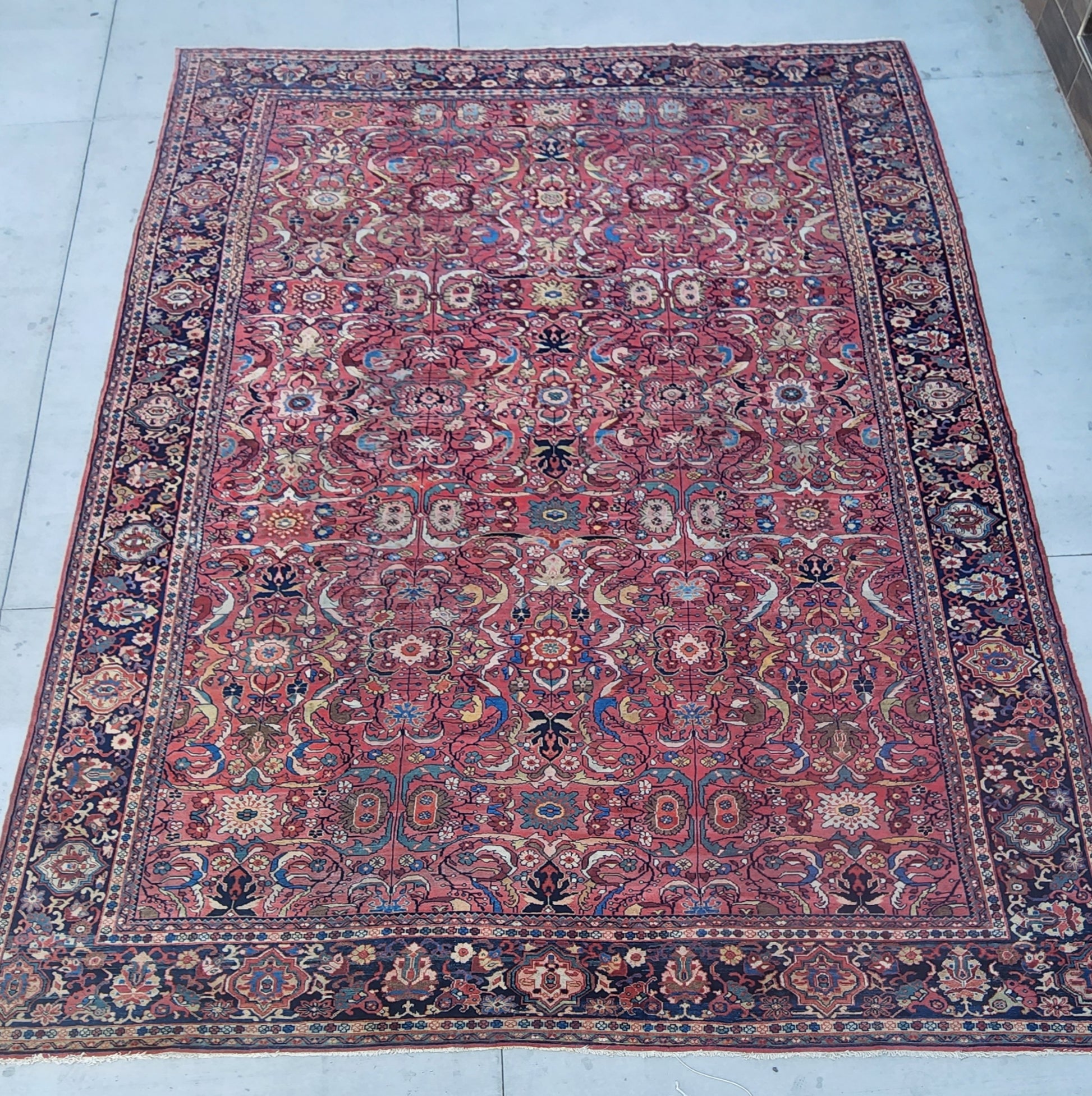 This Antique Mahal rug exemplifies the grandeur and intricate artistry of Persian rug weaving. Known for their lush, elaborate floral patterns and vibrant color palettes, Mahal rugs like this one are highly sought after for their bold yet harmonious designs. The oversized dimensions make it an ideal statement piece for large living spaces, dining rooms, or grand entryways.