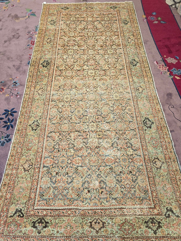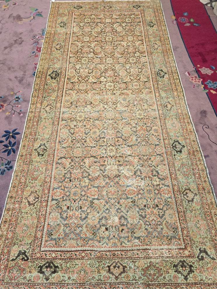 Introduce timeless sophistication to your home with this stunning Antique Malayer rug, a captivating piece of Persian weaving artistry. Measuring 5.2 x 11.4 feet, this finely handwoven rug features an intricate all-over Herati (fish) pattern, reflecting the delicate craftsmanship and enduring beauty characteristic of Malayer rugs. Its muted indigo, ivory, and soft beige tones enhance its elegance, making it a perfect fit for both classic and contemporary interiors.