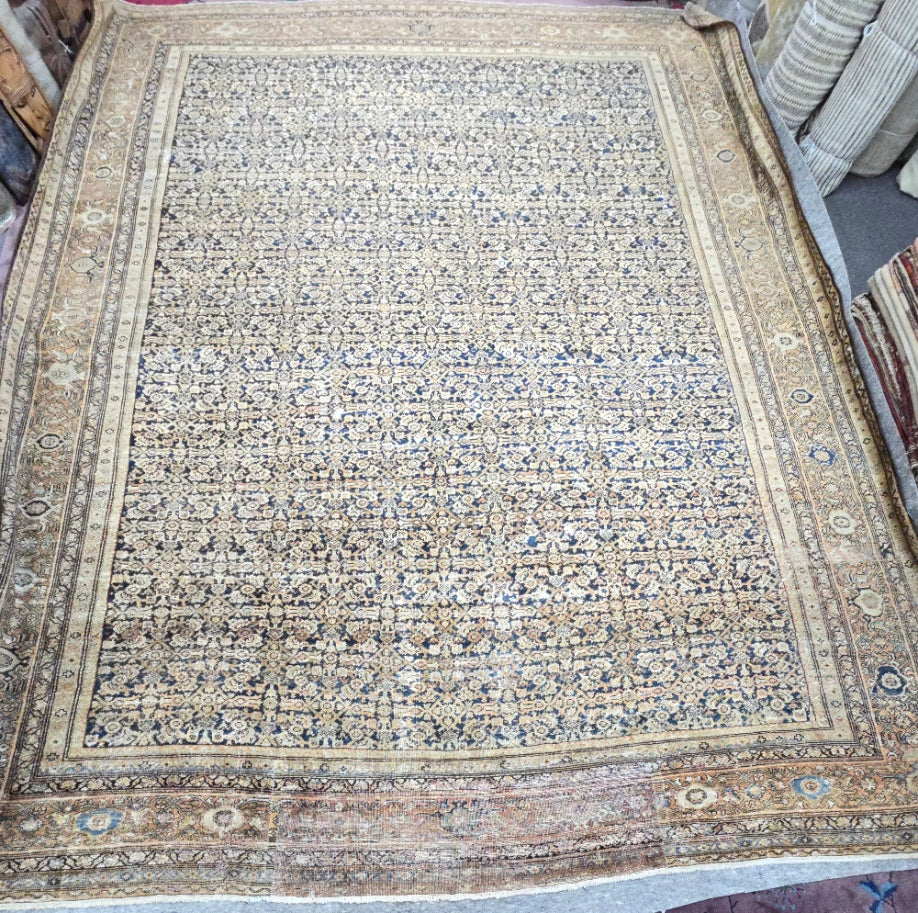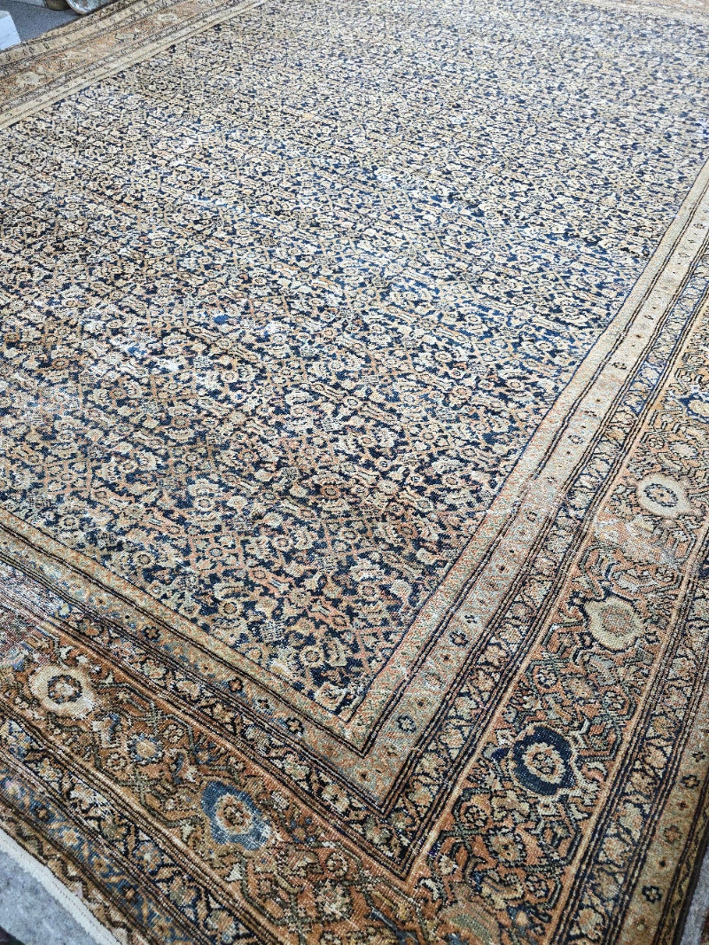 Bring home the elegance of Persian craftsmanship with this exquisite antique Persian Fereghan rug, an authentic piece from the early 20th century. Measuring 12.5 x 15.6 feet, this hand-knotted wool area rug features a graceful all-over floral pattern accented by ornate palmettes and medallions. The soft grey, beige muted blues, and earth tones create a sophisticated palette, while the distressed patina enhances the rug’s vintage charm.