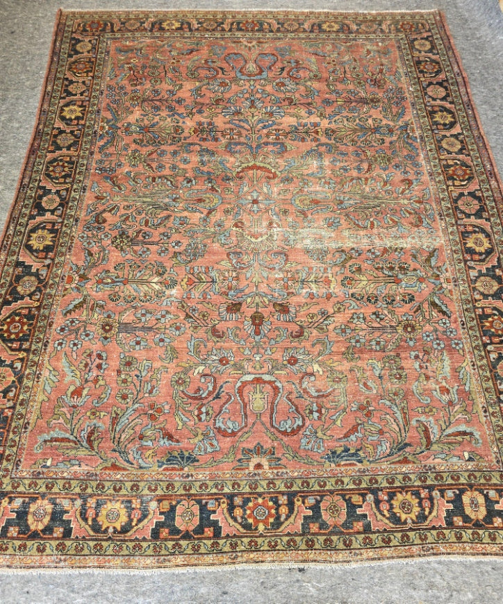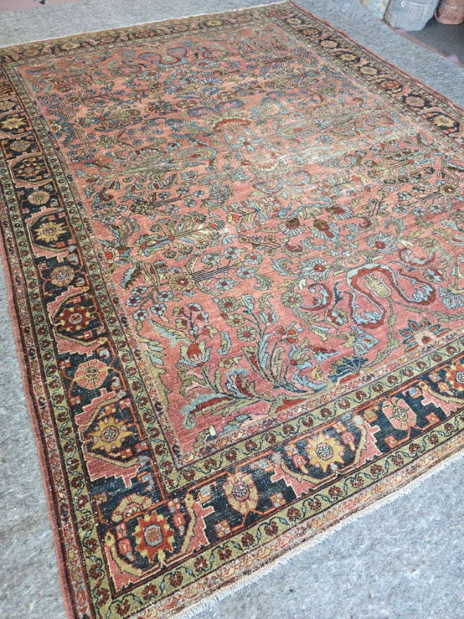 Originating from the Lilihan region of Persia (modern-day Iran), this rug features a richly decorative floral designwith symmetrical arrangements of vines, palmettes, and blossoms. The rug's rust-orange field is contrasted by intricate sky-blue and ivory floral accents, framed by a classic navy and beige border. This balanced composition embodies the grace and tradition of Persian rugs, while the subtle distressed patina enhances its antique appeal.