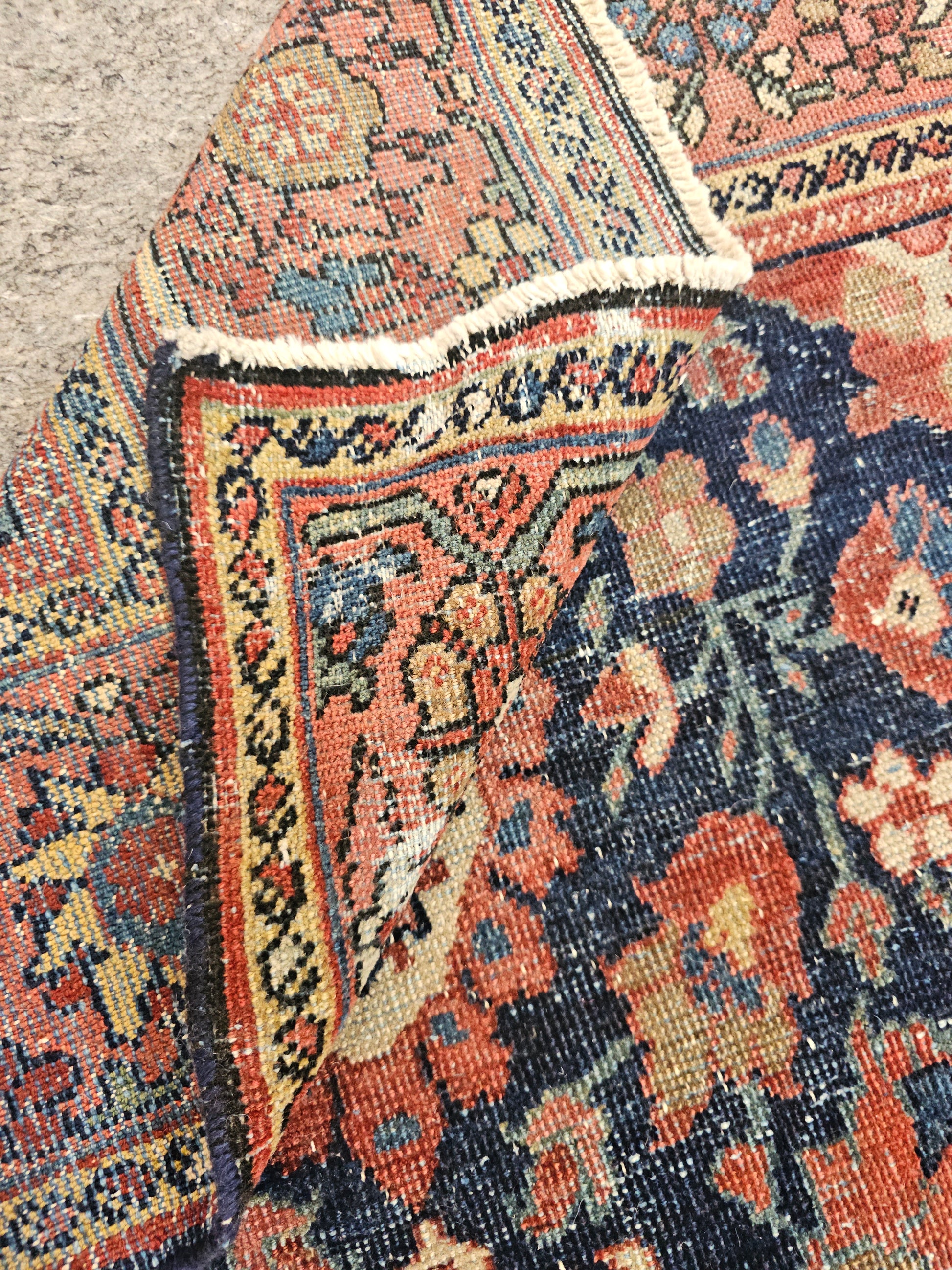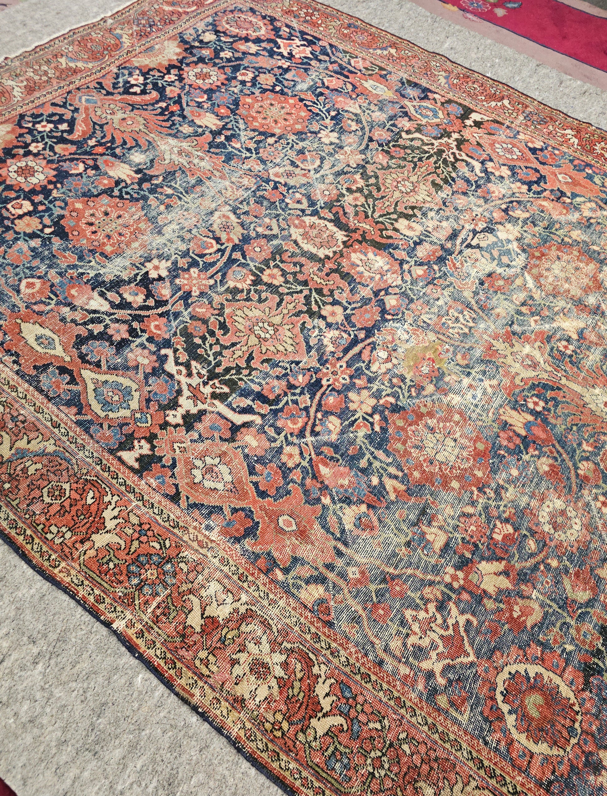 Woven in the Mahal region of Persia, this rug showcases the distinctive large-scale floral designs that Mahal rugs are renowned for. The field is adorned with ornate blossoms, vines, and palmettes, set against a deep navy backgroundthat contrasts beautifully with rust, ivory, and soft blue accents. The detailed border, rich with geometric and floral motifs, frames the piece elegantly, adding balance and definition.