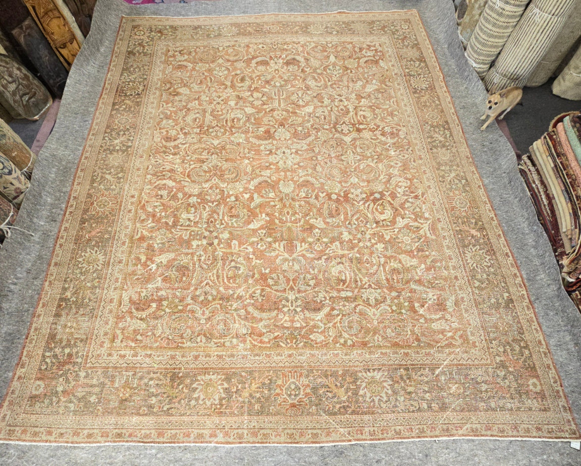 Woven in the historic city of Tabriz, Persia (modern-day Iran), this rug reflects the city’s centuries-old weaving tradition, celebrated for fine knot density and masterful design. The central field showcases an elegant all-over floral pattern, while the wide border features scrolling vines and palmettes, creating a perfect balance between ornate detail and open space.