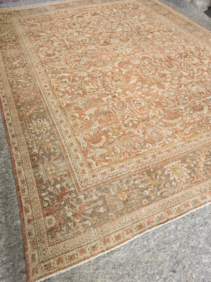 Infuse your home with timeless elegance and rich Persian heritage with this antique Persian Mahal rug, dating back to circa 1920. Measuring 10 x 13.6 feet, this exquisite rug embodies the artistry and precision for which Mahal Weavers are renowned. Its intricate floral motifs and delicate medallion patterns are beautifully set against a warm terracotta field, softened by accents of sky blue, ivory, and beige.