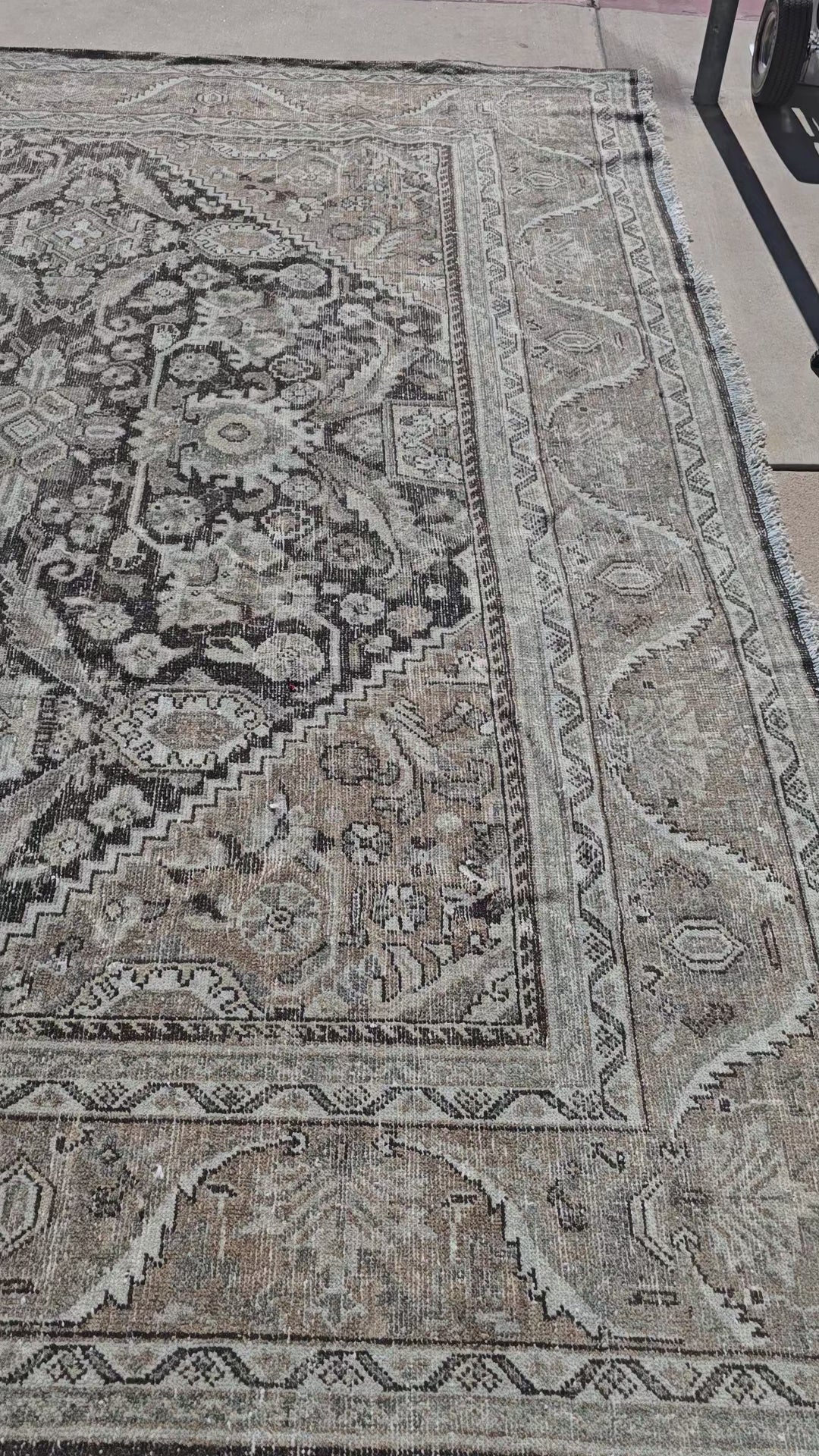 Bring home the elegance of Persian craftsmanship with this exquisite antique Persian Mahal rug, an authentic piece from the early 20th century. Measuring 10.6 x 17.3 feet, this hand-knotted wool area rug features a graceful all-over floral pattern accented by ornate palmettes and medallions. The soft grey, beige muted blues, and earth tones create a sophisticated palette, while the distressed patina enhances the rug’s vintage charm.