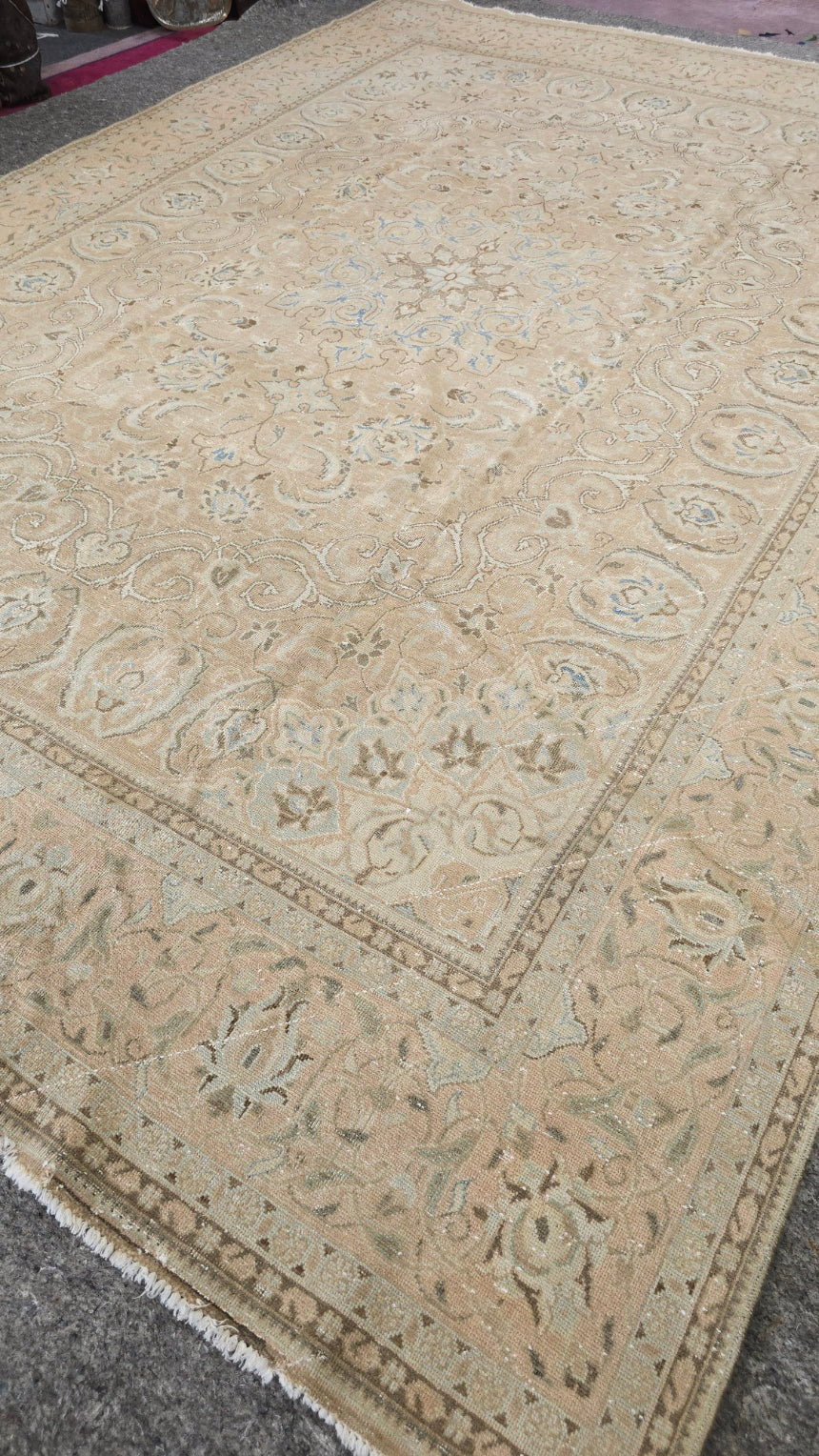 This large vintage Persian rug is adorned with graceful scrolling vines and ornate leaves, embodying the traditional floral motifs of Tabriz carpets. Its faded distressed finish exudes an air of sophistication, making it an ideal centerpiece for formal living rooms, dining spaces, or grand entryways.