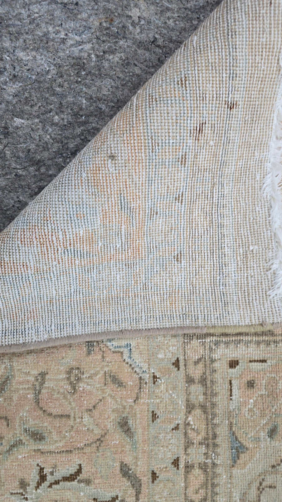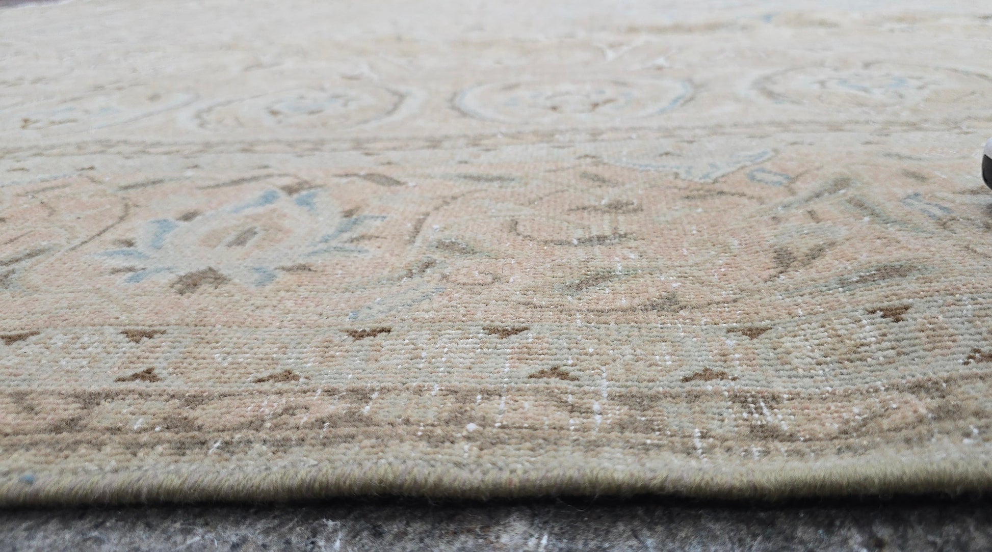 Elevate your home with the refined elegance of this antique Persian Tabriz rug, a stunning display of the artistry and craftsmanship synonymous with Tabriz weavers. Measuring 9 x 13 feet, this hand-knotted floral rug features an elaborate all-over palmette and vine pattern, woven in soft hues of sage, coral, and ivory. The delicate patina adds a sense of vintage charm, reflecting the timeless character and intricate design that define collectible Persian rugs.