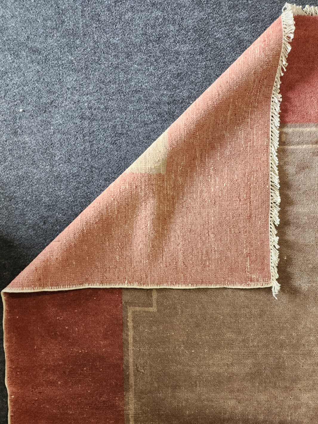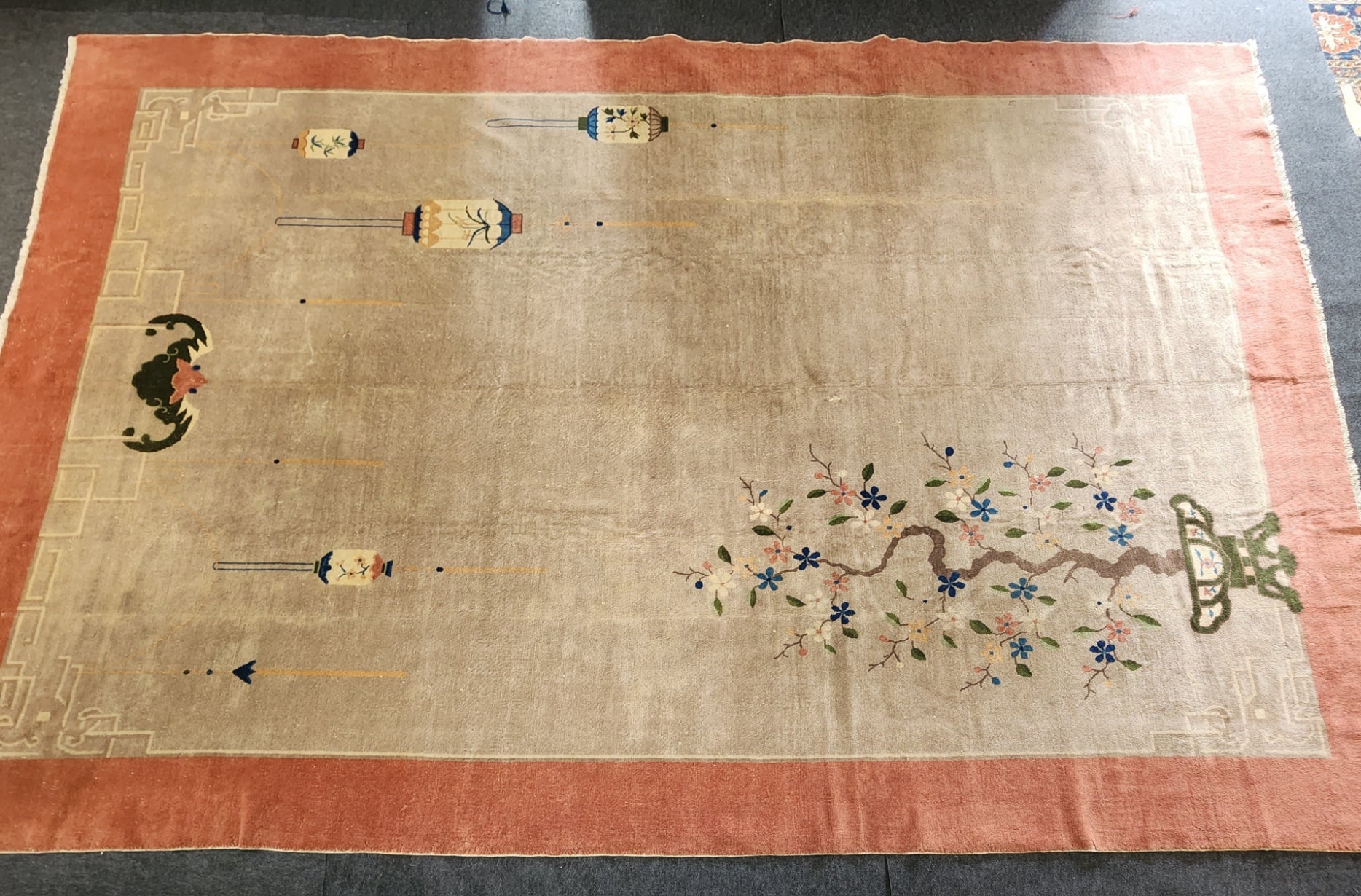 The rug’s blush pink border frames a neutral ivory field adorned with floating lanterns, floral branches, and a gracefully designed vase motif. The asymmetrical placement of the floral arrangement and lanterns reflects the artistic influence of the Art Deco period, blending Chinese symbolism with modern elegance. This rare piece perfectly balances simplicity and sophistication, making it ideal for living rooms, bedrooms, or formal spaces.