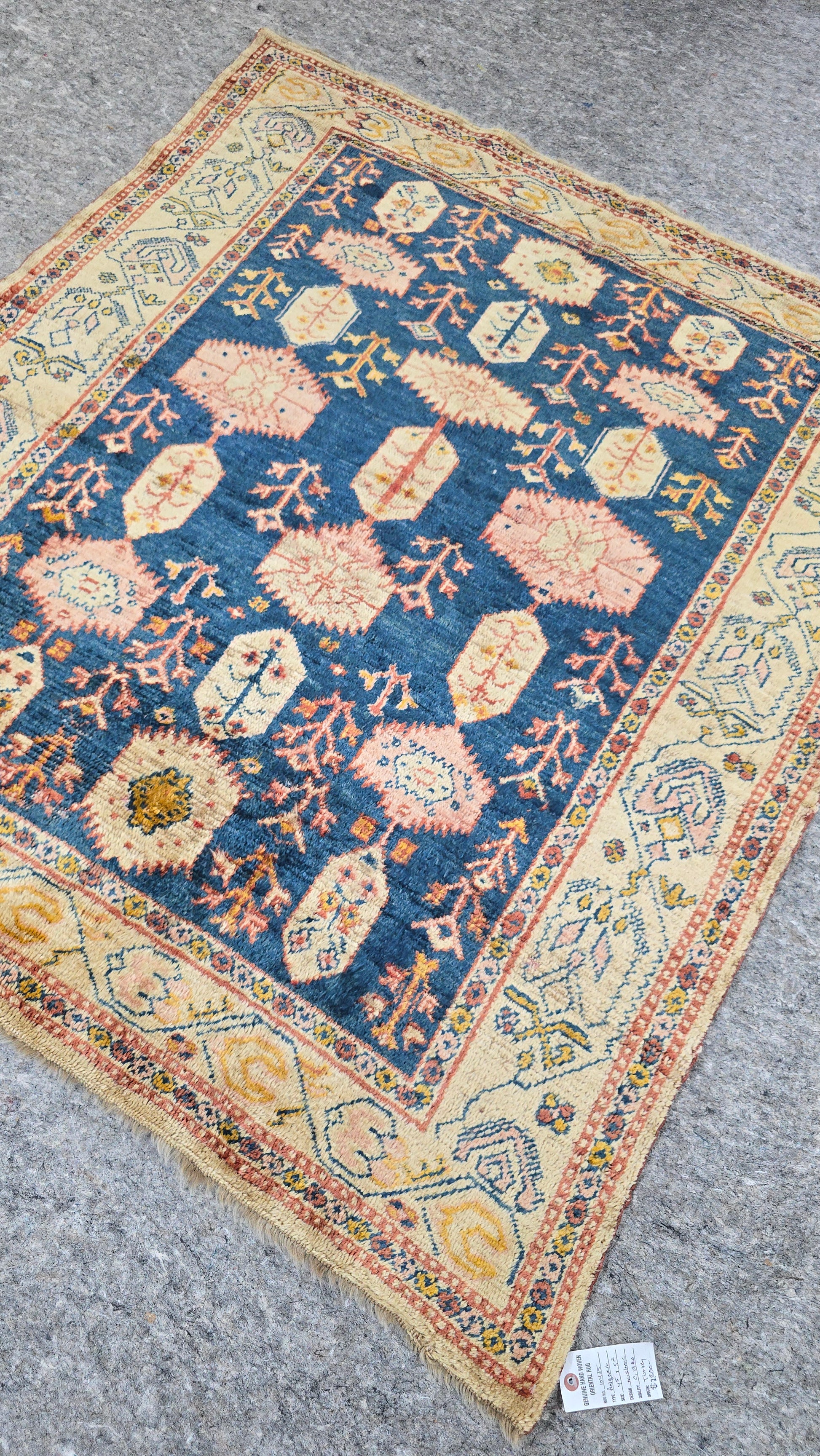 Handwoven by artisans in Oushak, Turkey, this rug showcases the region’s signature style – large-scale floral designs, soft color palettes, and plush textures. The use of a vibrant blue field, rarely seen in Oushak rugs of this period, makes this piece exceptionally unique and valuable. The design reflects traditional Ottoman influences, blending geometric and floral elements harmoniously.