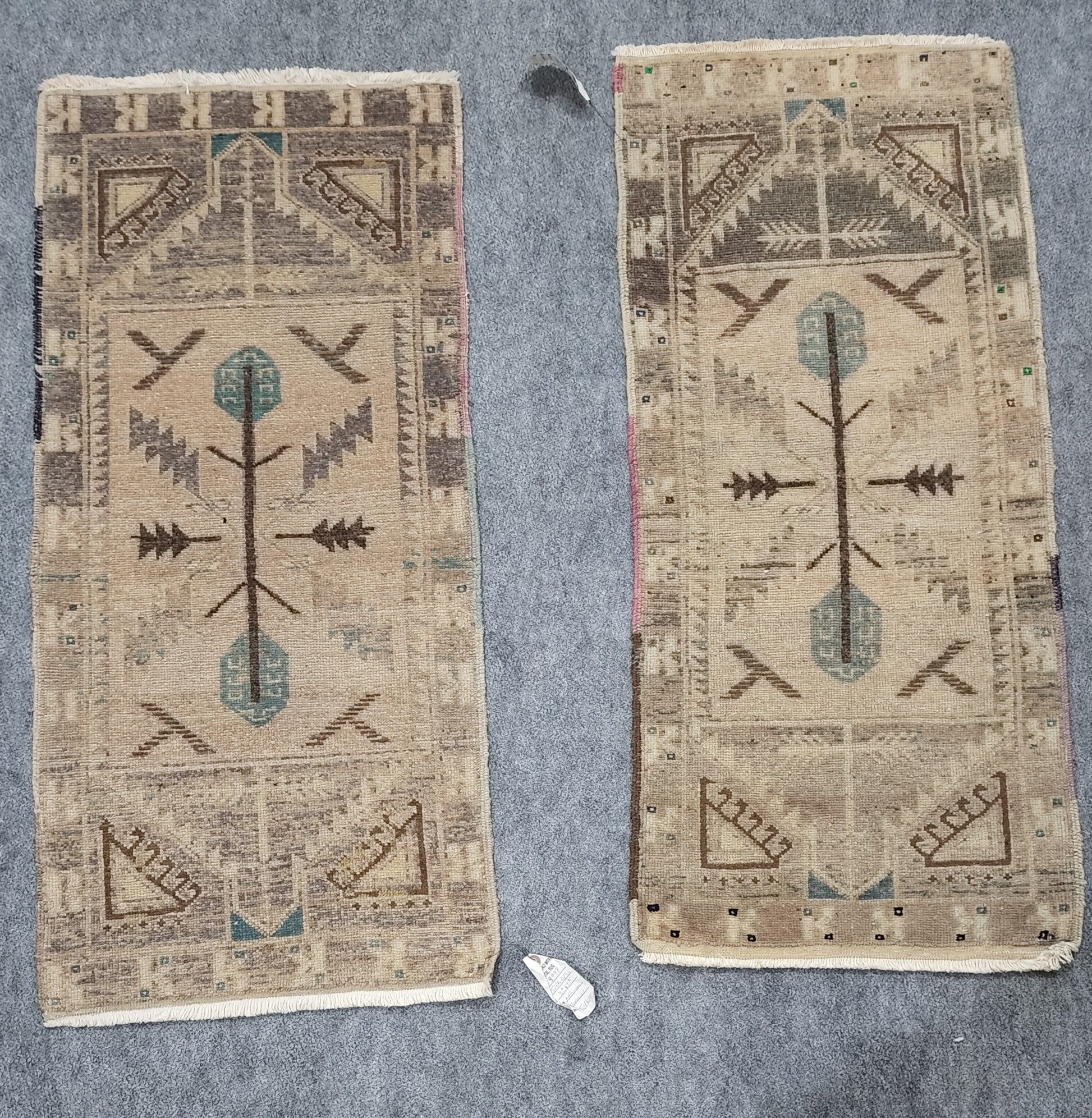 Enhance your space with this charming antique pair of Turkish rugs, crafted with tribal geometric designs and soft, neutral tones. Measuring 1.8 x 3.6 feet each, these petite rugs are perfect for entryways, bedside accents, or layered styling.