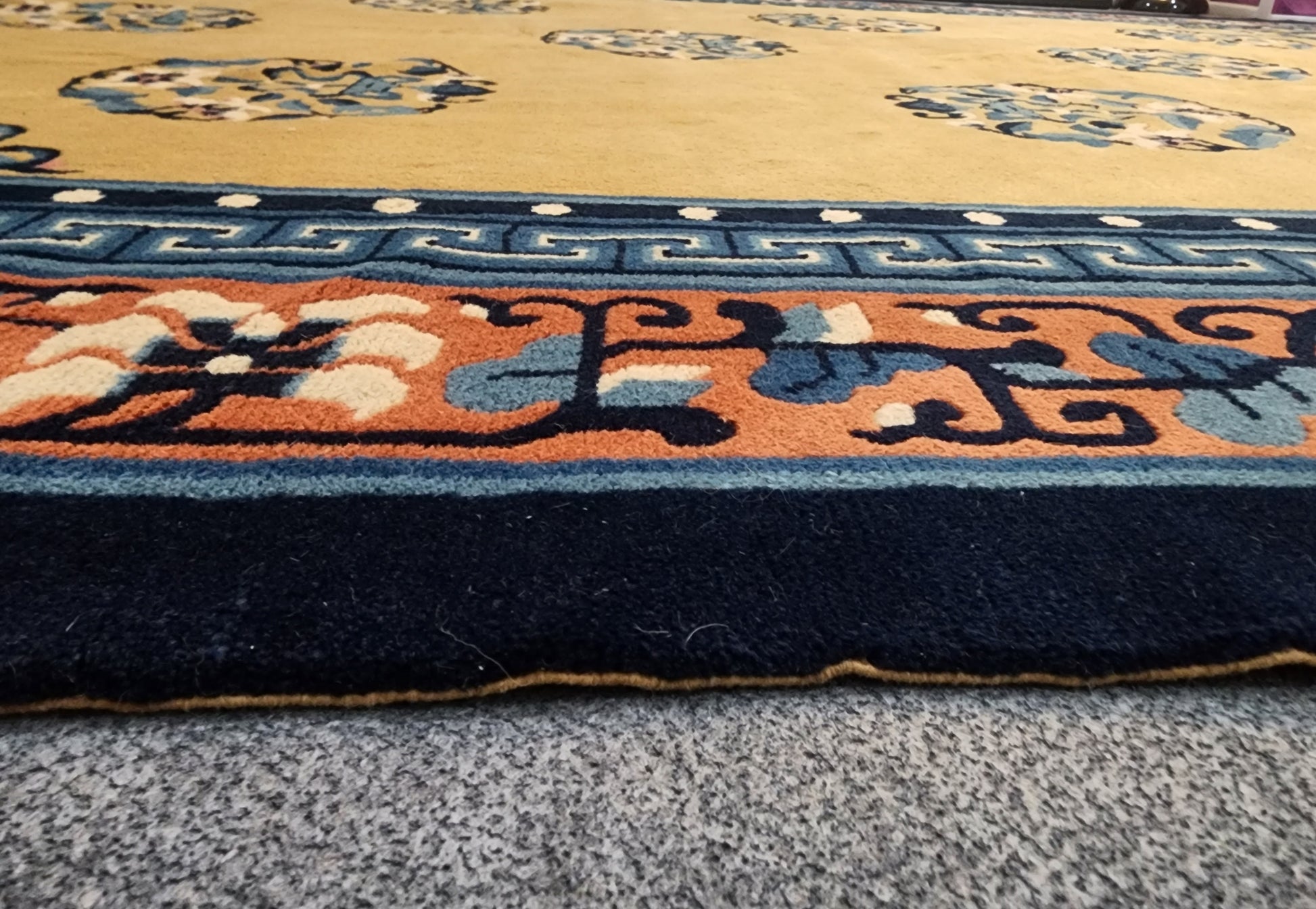 Elevate your space with the refined elegance of this Original 1970 Chinese Peking Rug, a pristine example of traditional Chinese rug artistry. Measuring 6.8 x 9.7 feet, this rug features a serene golden field punctuated by symmetrical floral medallions in soft blue and ivory hues. The corners boast elaborate floral scrolls, while the rich border incorporates classic Greek key patterns and delicate blossoms, reflecting the timeless aesthetics of Chinese craftsmanship.