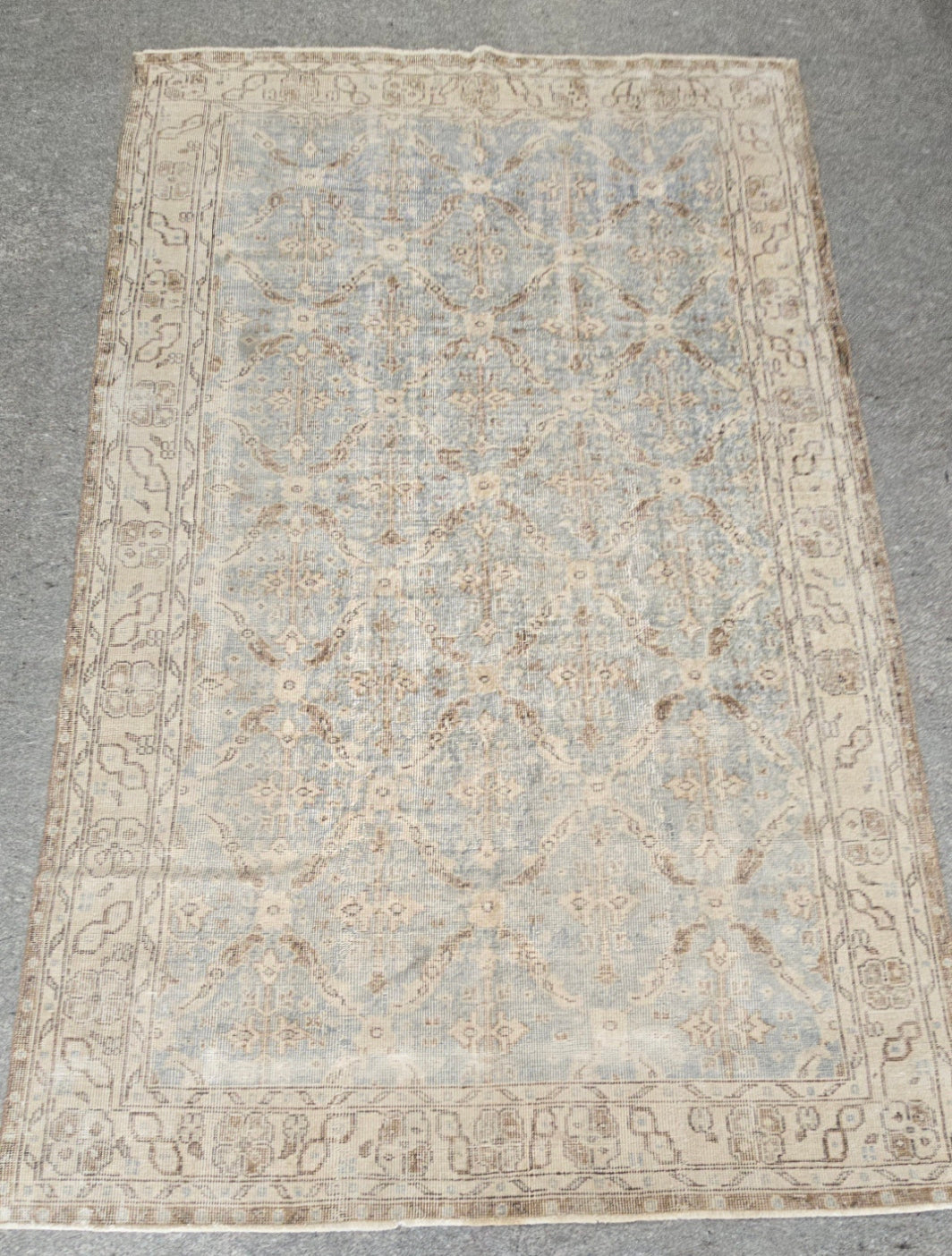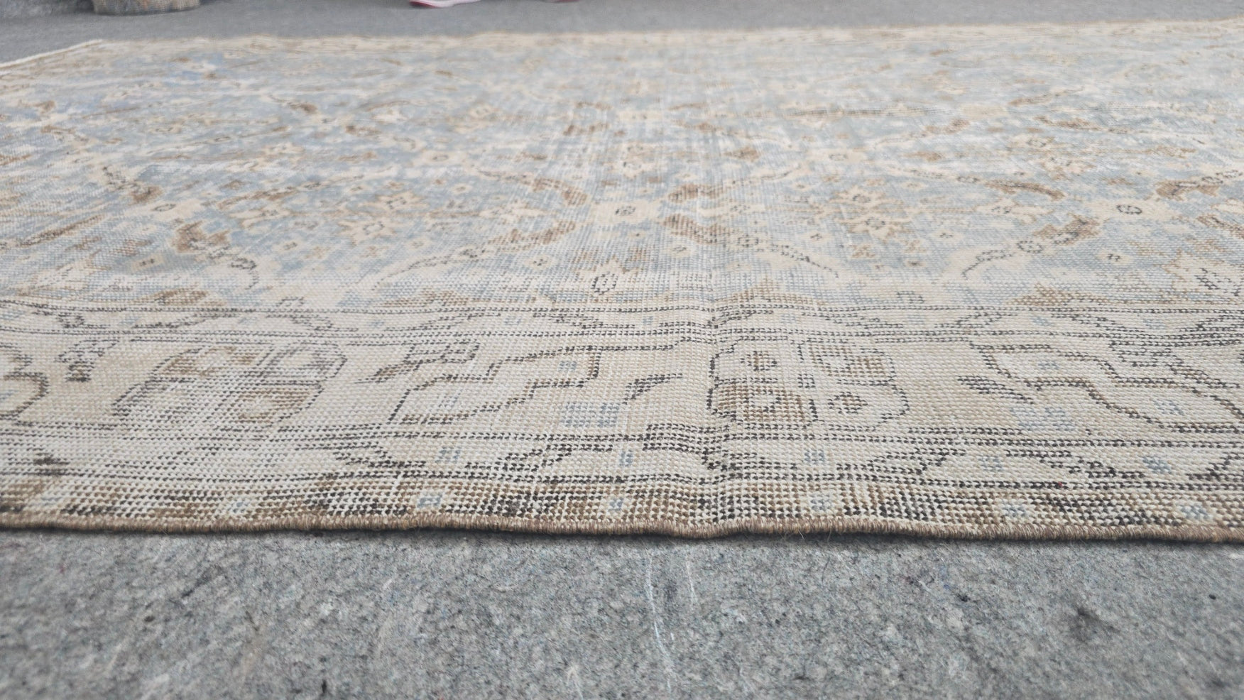 Experience the serene elegance of a distressed overdyed Persian rug that radiates timeless sophistication. Measuring 9.8 x 12.3 feet, this expansive rug blends intricate traditional patterns with a soft, faded palette of blues, grays, and ivory. Its delicate floral motifs peek through the artfully worn finish, creating a subtle yet captivating statement piece for your home.
