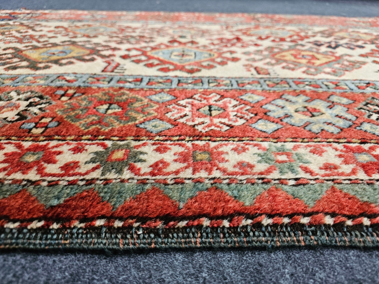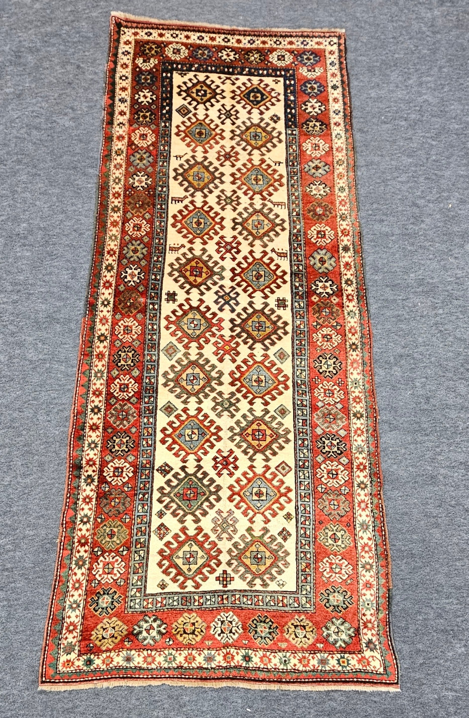 Step into the rich history of Caucasian weaving with this collector's antique Kazak rug from the late 19th century. Measuring 4 x 10 feet, this stunning full-pile runner features bold geometric motifs and vibrant hues of red, ivory, and earthy tones. The repeating diamond and hooked medallion patterns reflect the artistry and symbolism characteristic of traditional Kazak rugs.