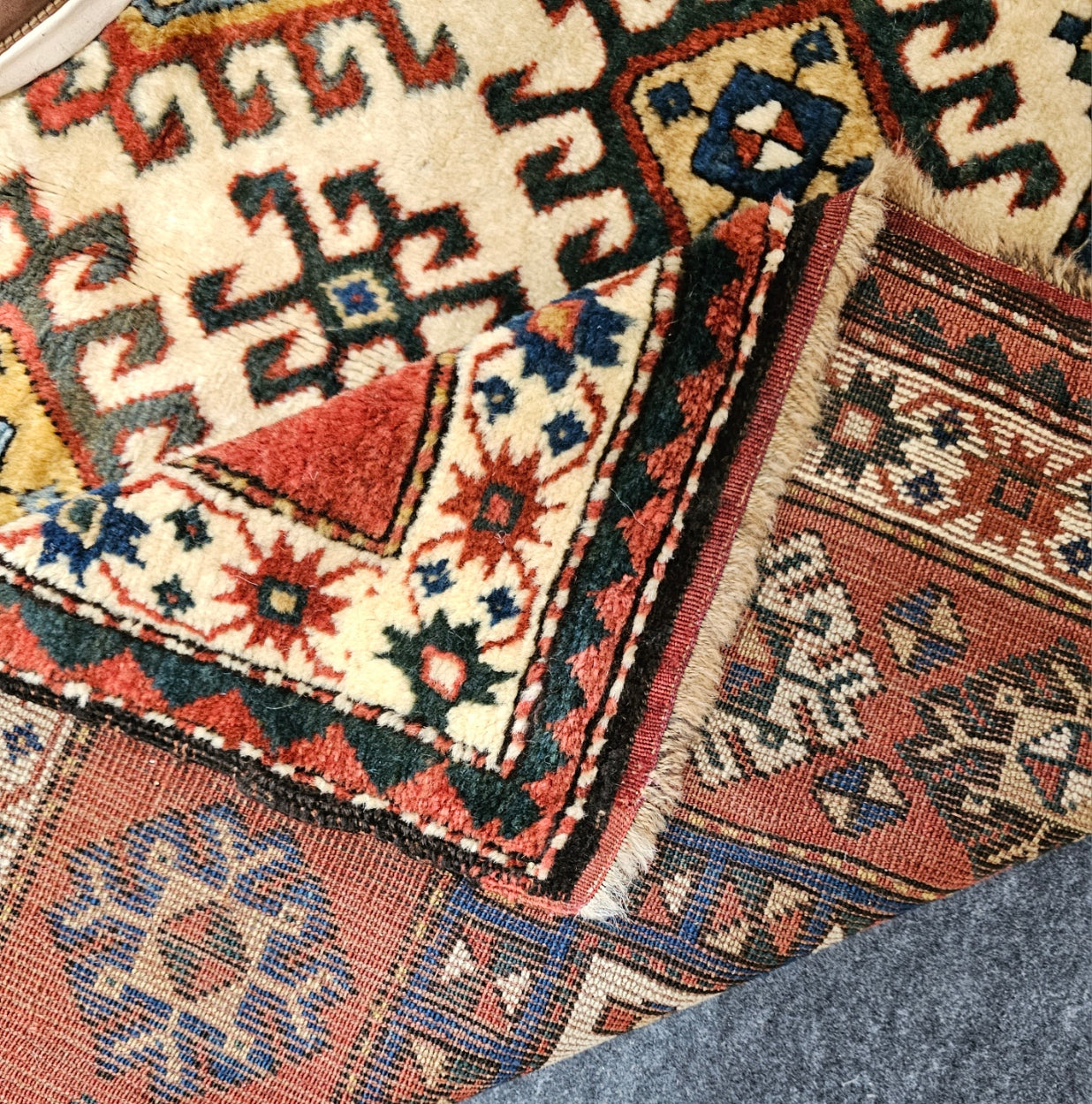 A rare find for collectors and enthusiasts, this Kazak rug embodies the tribal charm and craftsmanship of late 19th-century Caucasian textiles.