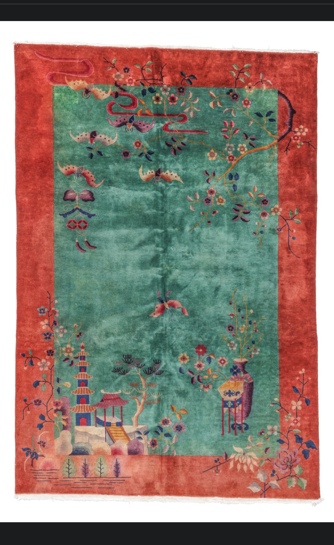 The most recognizable rugs from the 1920s and 1930s are Chinese Rugs made by Walter Nichols. These Nichols rugs, as they came to be known, were primarily made during the Art Deco movement in the early 20th Century. They were usually made of wool and silk and depicted floral designs in very rich, bold colors like magenta, turquoise, emerald, canary and ruby. They either had a very thick border or none at all. Nichols specialized in a mechanized wool spinning technique that produced a very thick strand - ideal for rugs. He was inspired by the works of many Art Deco artists and began to incorporate some classic deco motifs into his designs. Nichols rugs became wildly popular in the Art Deco era - they were luxurious and exotic - the epitome of Art Deco style.