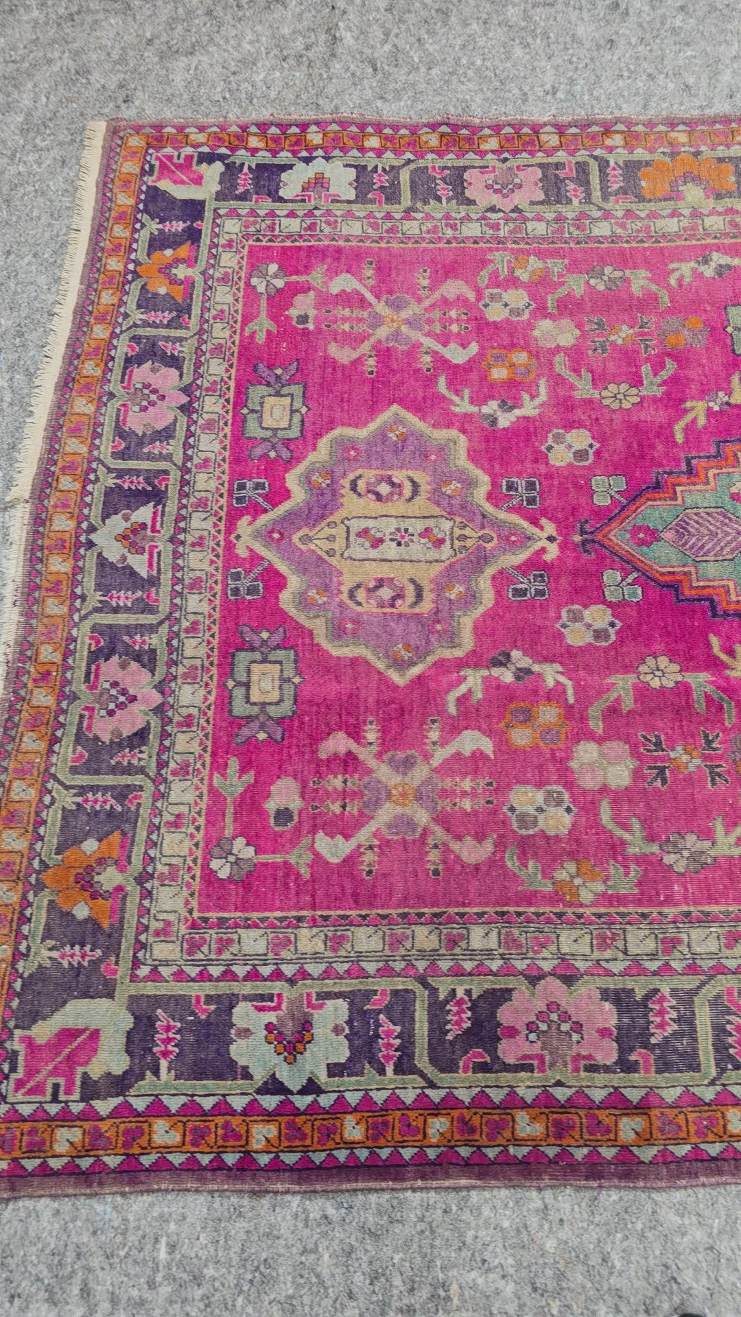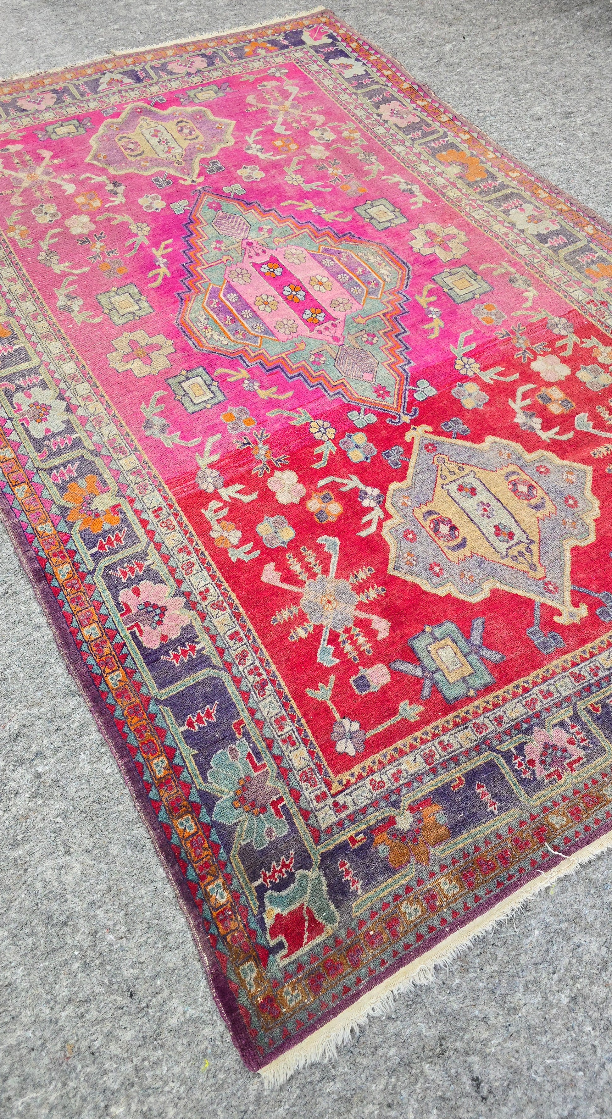 Care: Handle with care to preserve its antique condition. Vacuum gently and avoid direct sunlight to maintain color vibrancy. Professional cleaning is recommended for long-term care.