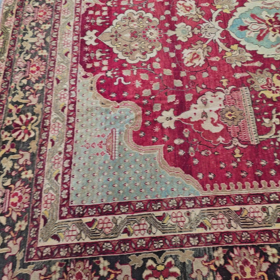 Bring a touch of timeless Anatolian artistry into your home with this antique Turkish kayseri rug, a rare and exquisite piece dating back to the 1930s. Measuring 9 x 12 feet, this rug features a striking red field adorned with oversized floral motifs and delicate vine patterns. The soft gold and ivory border frames the piece beautifully, creating a captivating contrast that enhances the rug’s bold, yet elegant design.