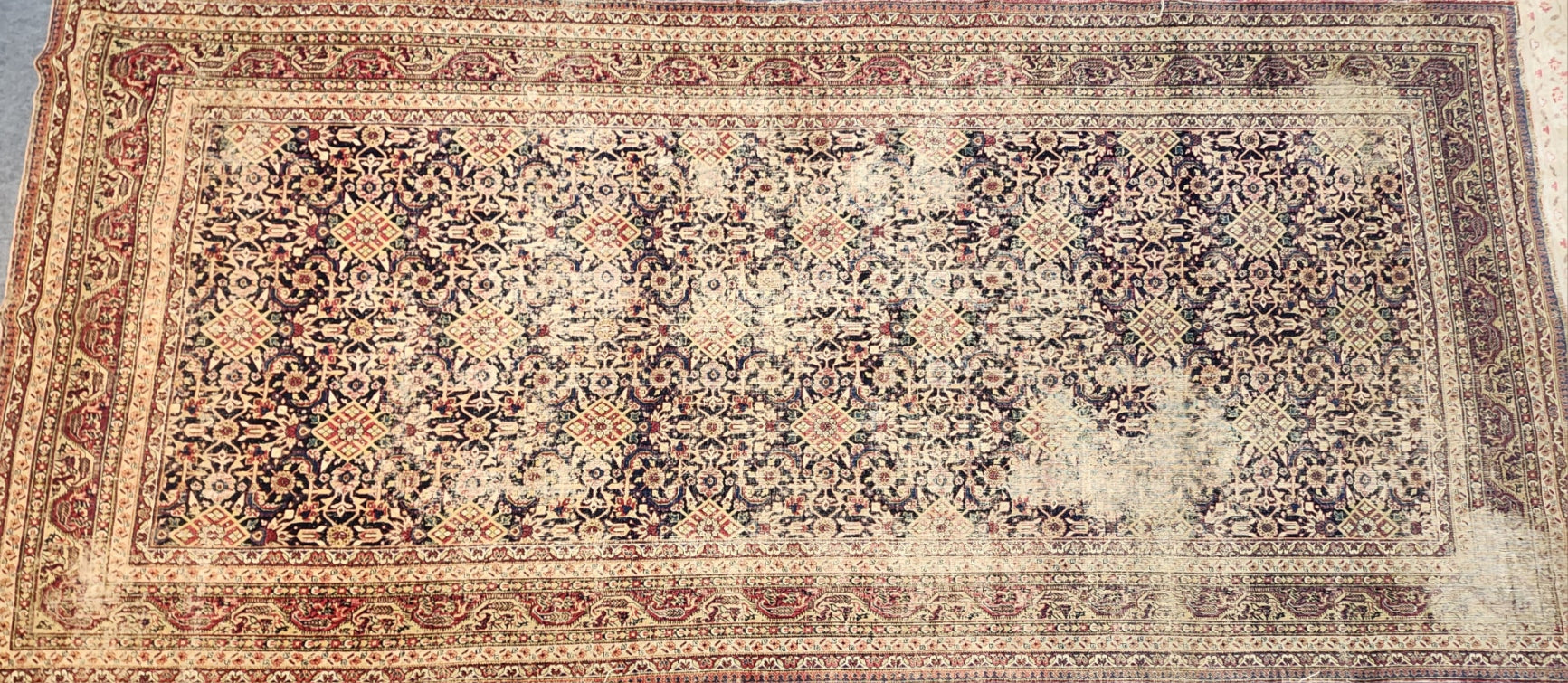 - Design: Dense floral field with diamond lattice motifs and detailed borders