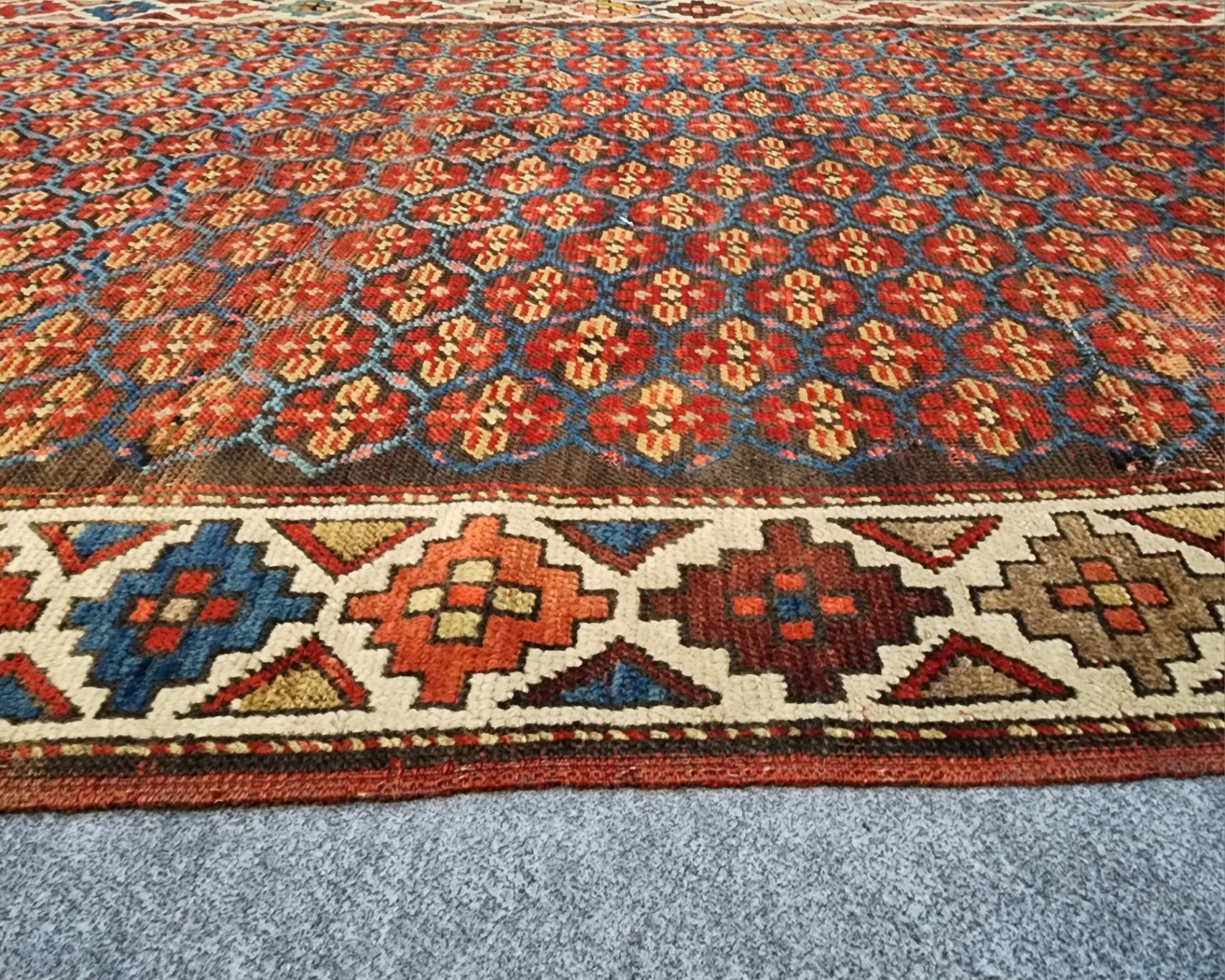 Add a vibrant piece of history to your home with this 19th Century Caucasian Kazak runner, a striking example of tribal artistry and craftsmanship. Measuring 4.2 x 9.3 feet, this runner features an intricate all-over lattice of repeating rosettes in warm terracotta, deep indigo, and soft ivory tones. The bold geometric border, characteristic of Kazak designs, frames the rug beautifully, creating a powerful visual statement.