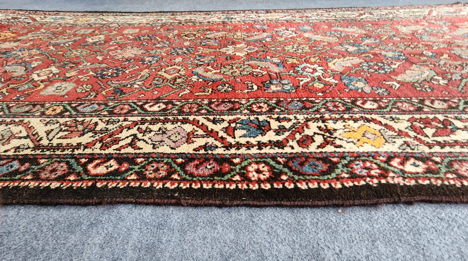 Infuse your space with the rich heritage and tribal artistry of this Antique Kurdish runner, woven in the early 1900s. Measuring 3.4 x 11 feet, this exquisite piece showcases a dense all-over floral pattern set against a warm terracotta field, framed by an elegant ivory border with intricate geometric and vine motifs. The vibrant color palette and fine detailing reflect the unique craftsmanship of Kurdish weavers, known for their bold designs and exceptional use of natural dyes.