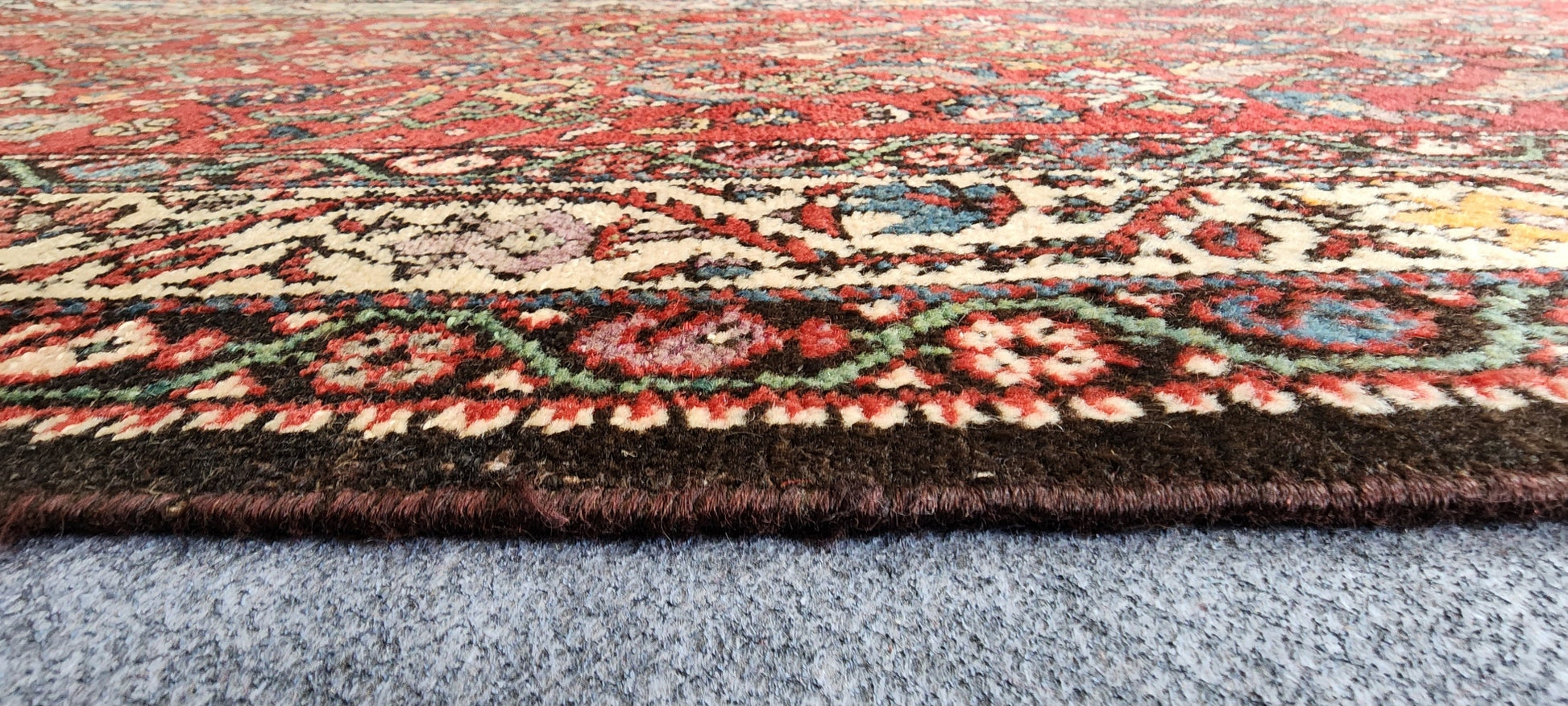 Kurdish rugs are renowned for their vibrant color combinations and intricate tribal patterns, reflecting the nomadic roots of their creators. This runner’s elongated size and detailed design make it a perfect fit for long hallways, entryways, or as an accent beside furniture. The interplay of floral motifs and geometric borders brings a sense of warmth and tradition to any space, while the rich patina highlights the rug’s authenticity and age.