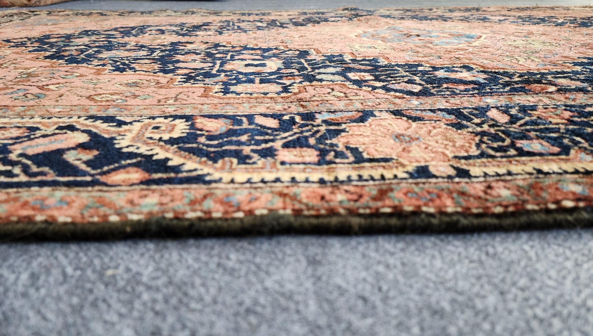 This exquisite Early 20th Century Malayer Sarouk rug showcases the harmonious blend of Persian artistry and rich floral motifs. Measuring 4.2 x 6.9 feet, this handwoven piece features a captivating central medallion, framed by intricate floral vines and an elegant border. The soft blush and indigo hues, complemented by delicate touches of sky blue and ivory, create a warm and timeless aesthetic perfect for any sophisticated interior.