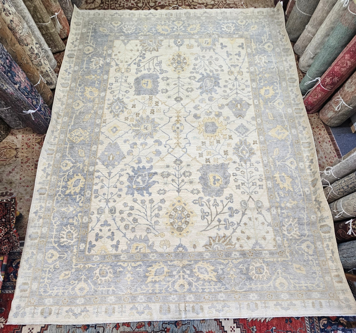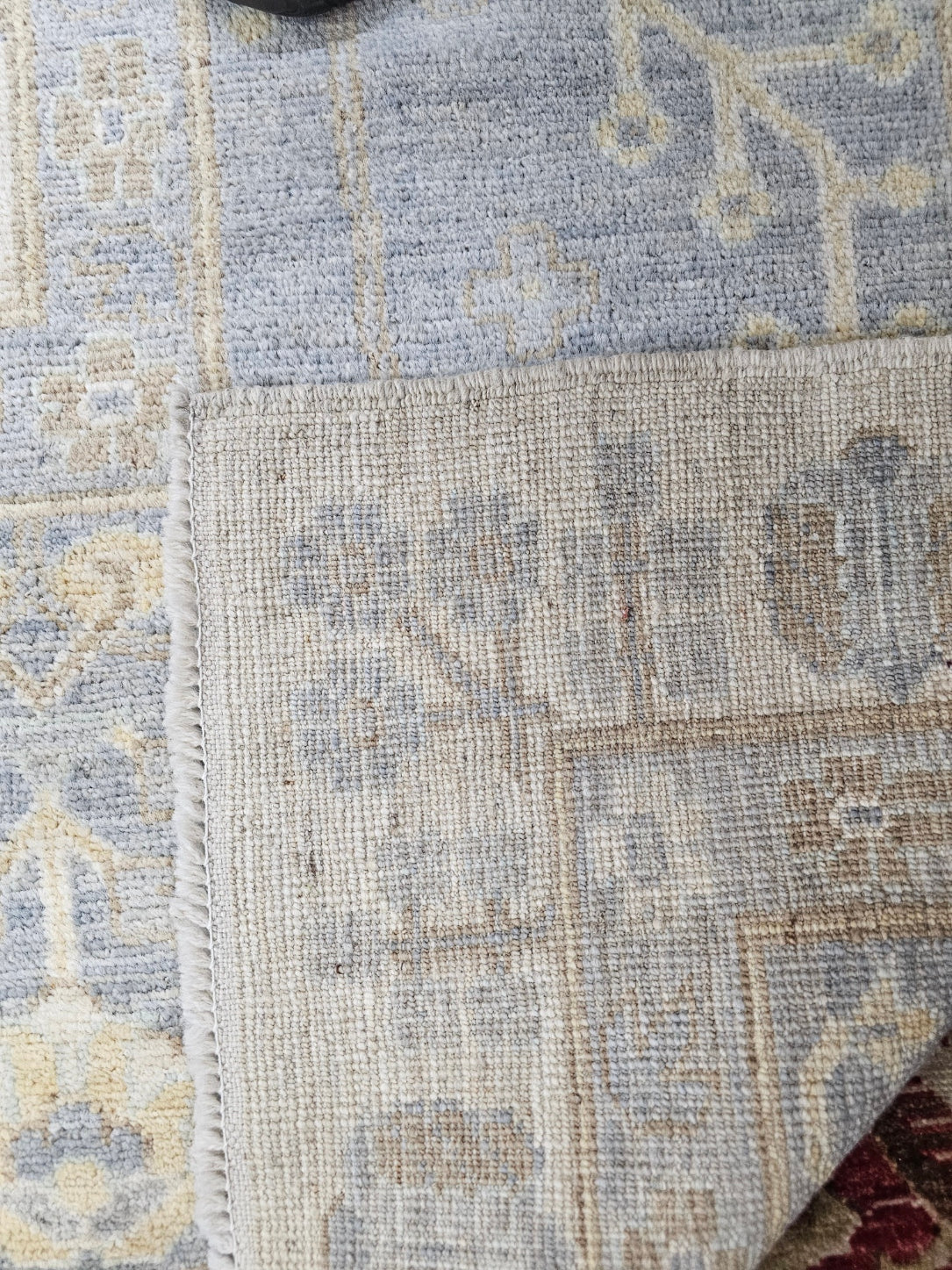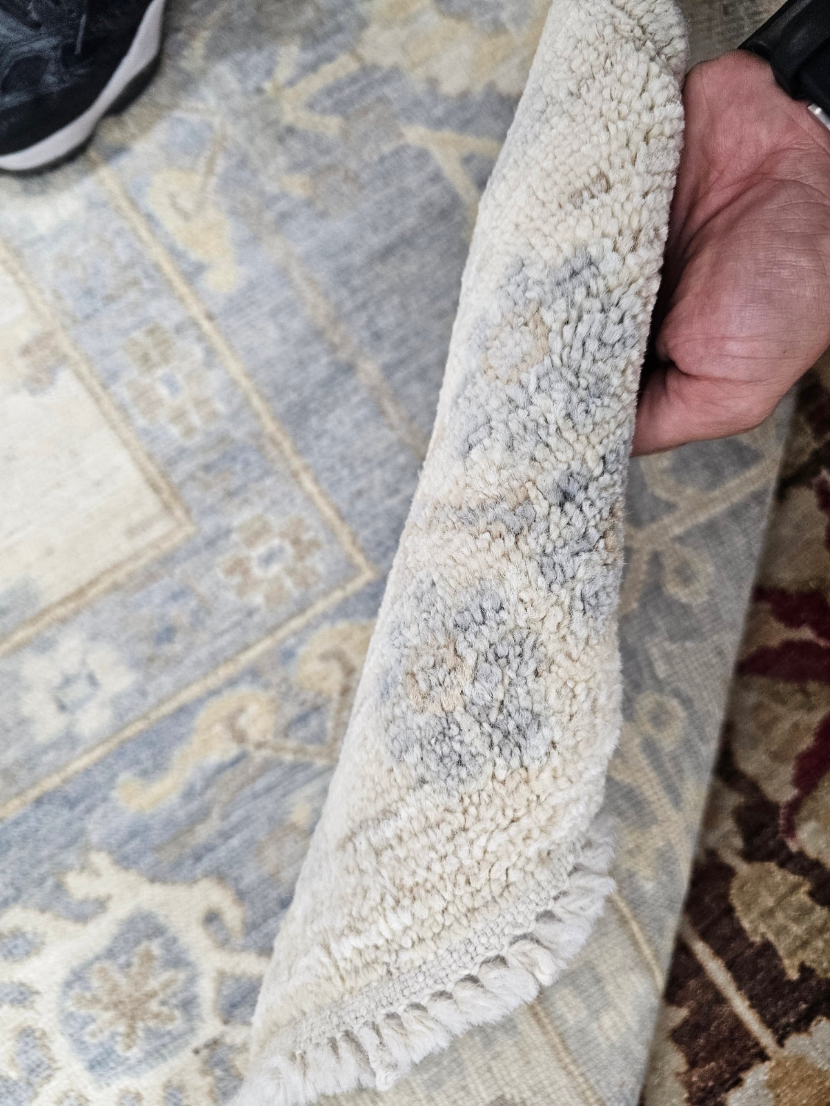 This Afghan Traditional Teawash Rug embodies timeless elegance with its soft, neutral color palette and intricate floral design. Measuring 10 x 14 feet, this hand-knotted piece features a delicate ivory field, beautifully complemented by subtle accents of muted blue, beige, and soft gray. The detailed floral and vine motifs flow gracefully across the rug, framed by an elaborate border that enhances the balance and sophistication of the design.
