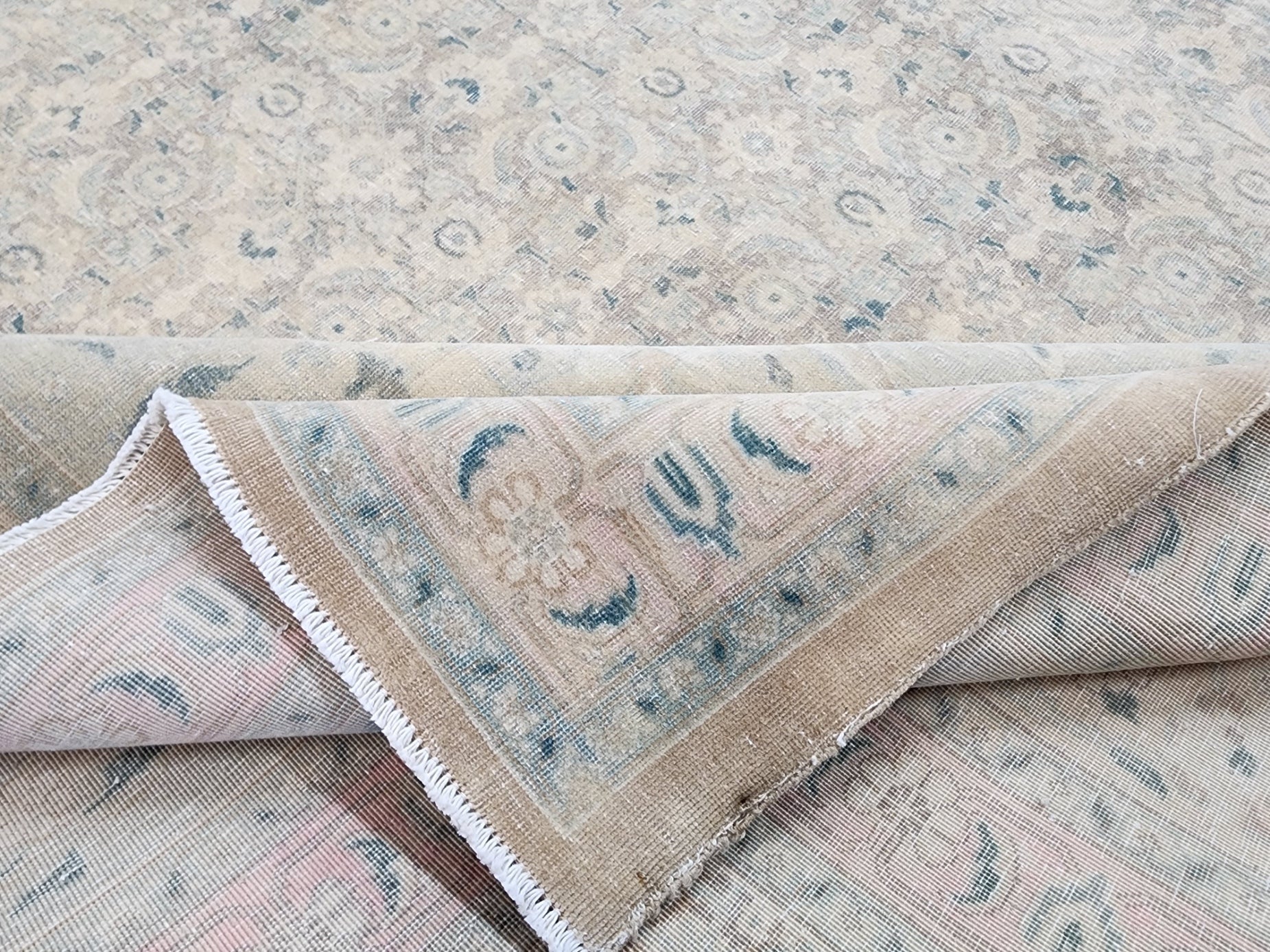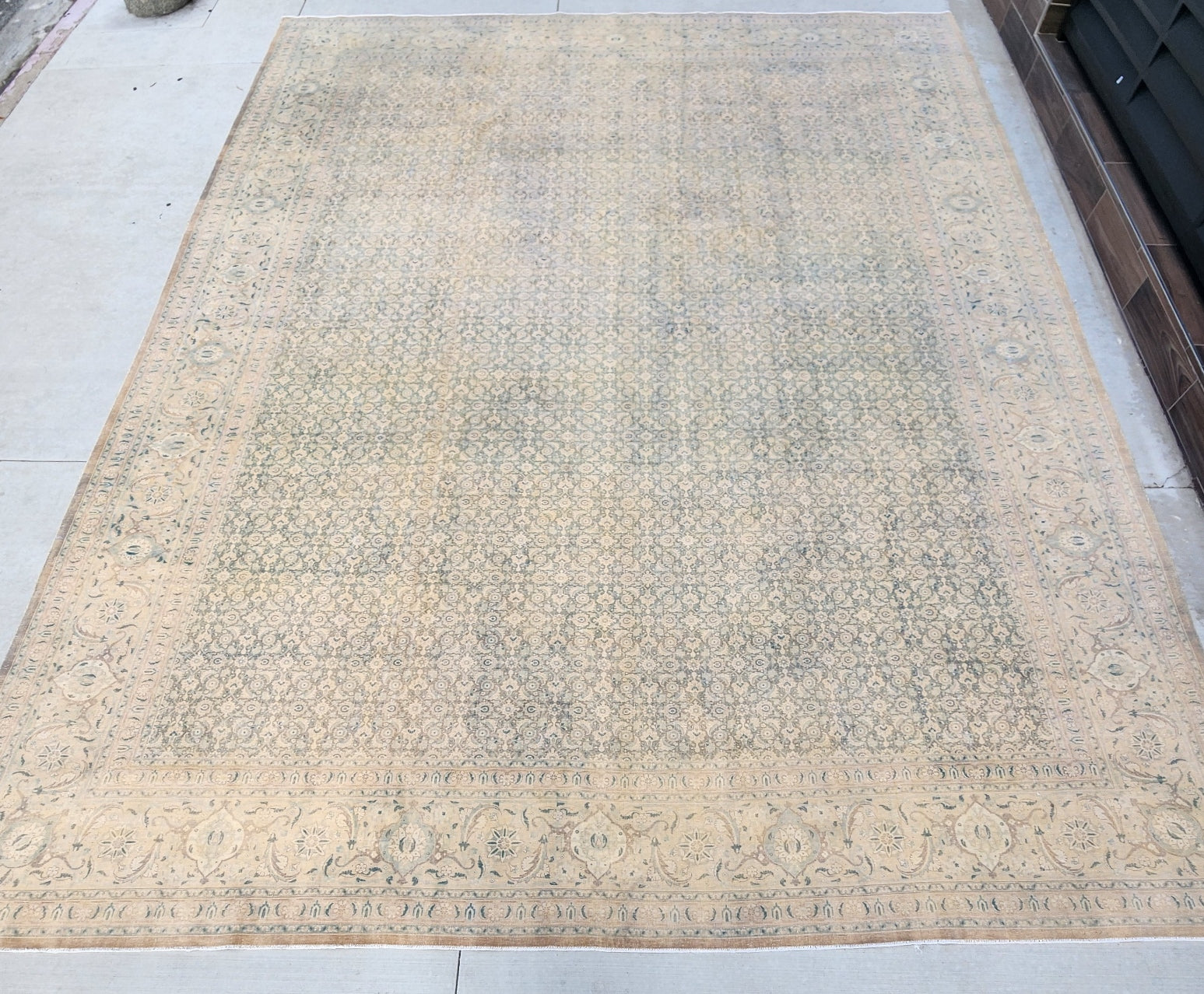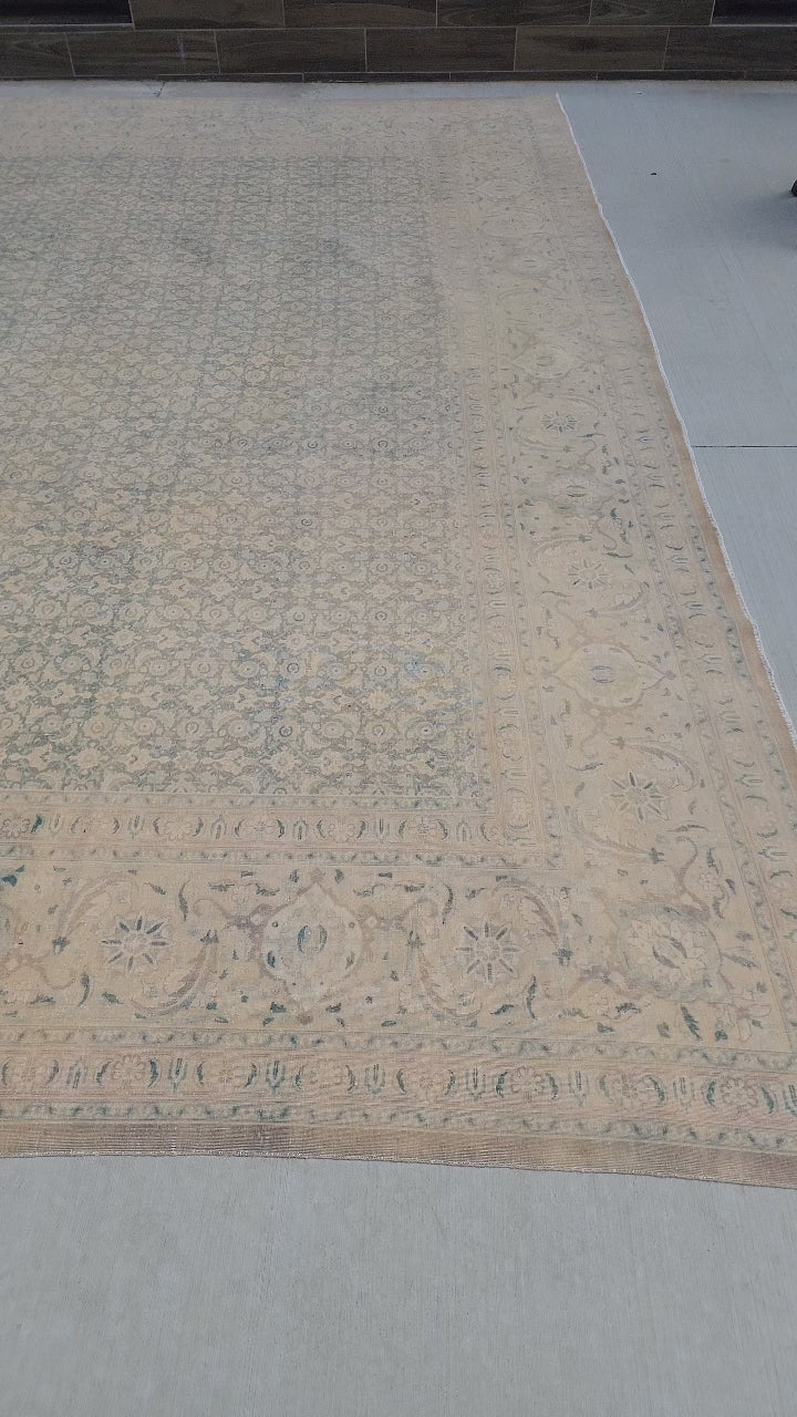Introduce timeless elegance to your home with this Antique Tabriz Rug, a grand and luxurious piece from the renowned Tabriz weaving tradition. Measuring 13' x 17'3", this large Persian rug features a delicately woven all-over floral pattern, framed by an ornate border with intricate detailing. The soft, muted palette of ivory, gold, and subtle sage creates an ethereal and refined aesthetic, perfect for enhancing formal living rooms, dining areas, or grand spaces.