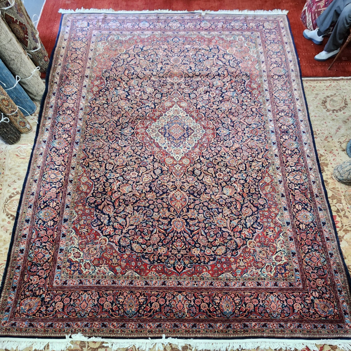 This Vintage Persian Kashan rug reflects the grandeur and artistry of traditional Persian weaving. With its rich navy field and intricate floral motifs, the rug features a classic central medallion design framed by an elaborate border of intertwining blossoms and vines. The striking red, ivory, and soft blues harmoniously contrast the darker background, enhancing the overall depth and elegance.