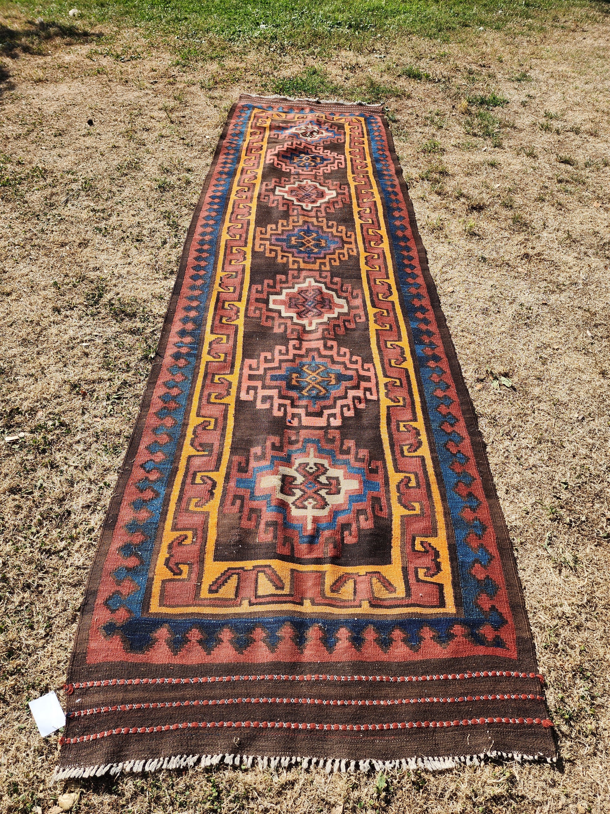 Elevate your space with this stunning vintage Turkish kilim runner, handwoven with intricate geometric patterns and rich earthy tones. Measuring 3.5x13.3 ft, this long, narrow rug is perfect for hallways, entryways, or as a statement piece in any room.