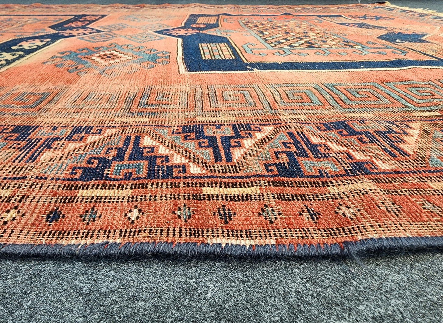 Karabagh rugs are celebrated for their bold geometric designs and vibrant colors, often inspired by Armenian and Azerbaijani weaving traditions. This rug's symmetrical medallions and detailed motifs reflect the cultural significance and artistry of the region. Its size makes it ideal for living rooms, offices, or as a statement piece in transitional spaces.