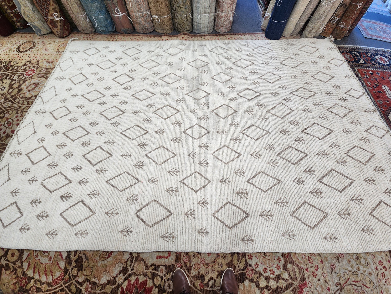 Infuse your space with timeless beauty and artisanal charm with this 9x12 Moroccan rug, showcasing an elegant all-over geometric pattern. The repeating diamond and tree motifs reflect traditional Berber designs, blending cultural heritage with a clean, modern aesthetic. The soft beige and brown tones create a warm, inviting foundation for any room.