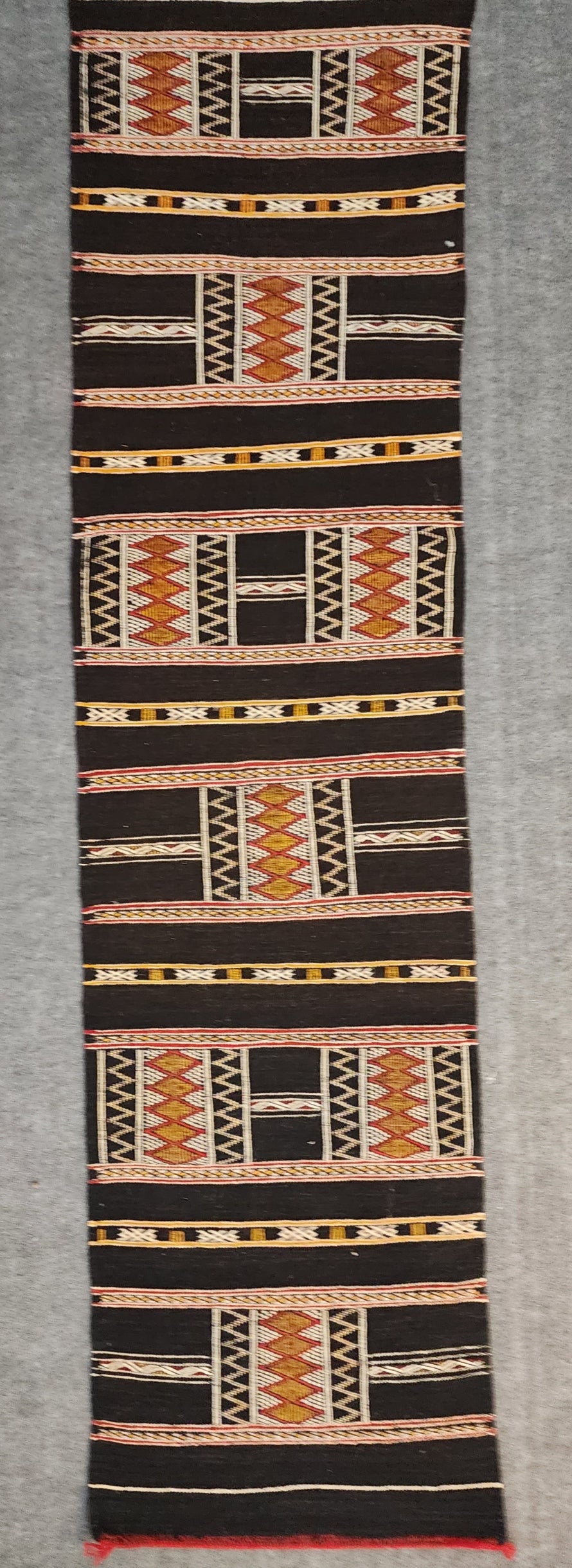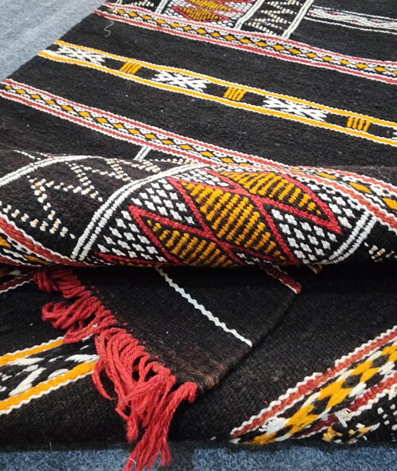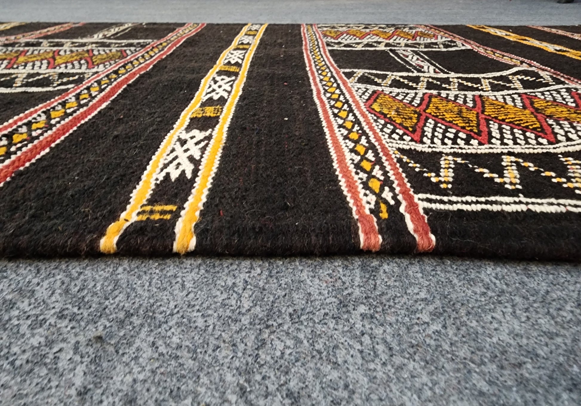 The bold black base is adorned with vibrant accents of rust, gold, and ivory, creating a beautiful contrast that enhances the rug's intricate details. Crafted from high-quality natural fibers, this runner offers durability and softness, making it both practical and stylish. Its tribal-inspired design reflects the rich heritage of Moroccan craftsmanship, seamlessly fitting into bohemian, eclectic, or modern interiors.
