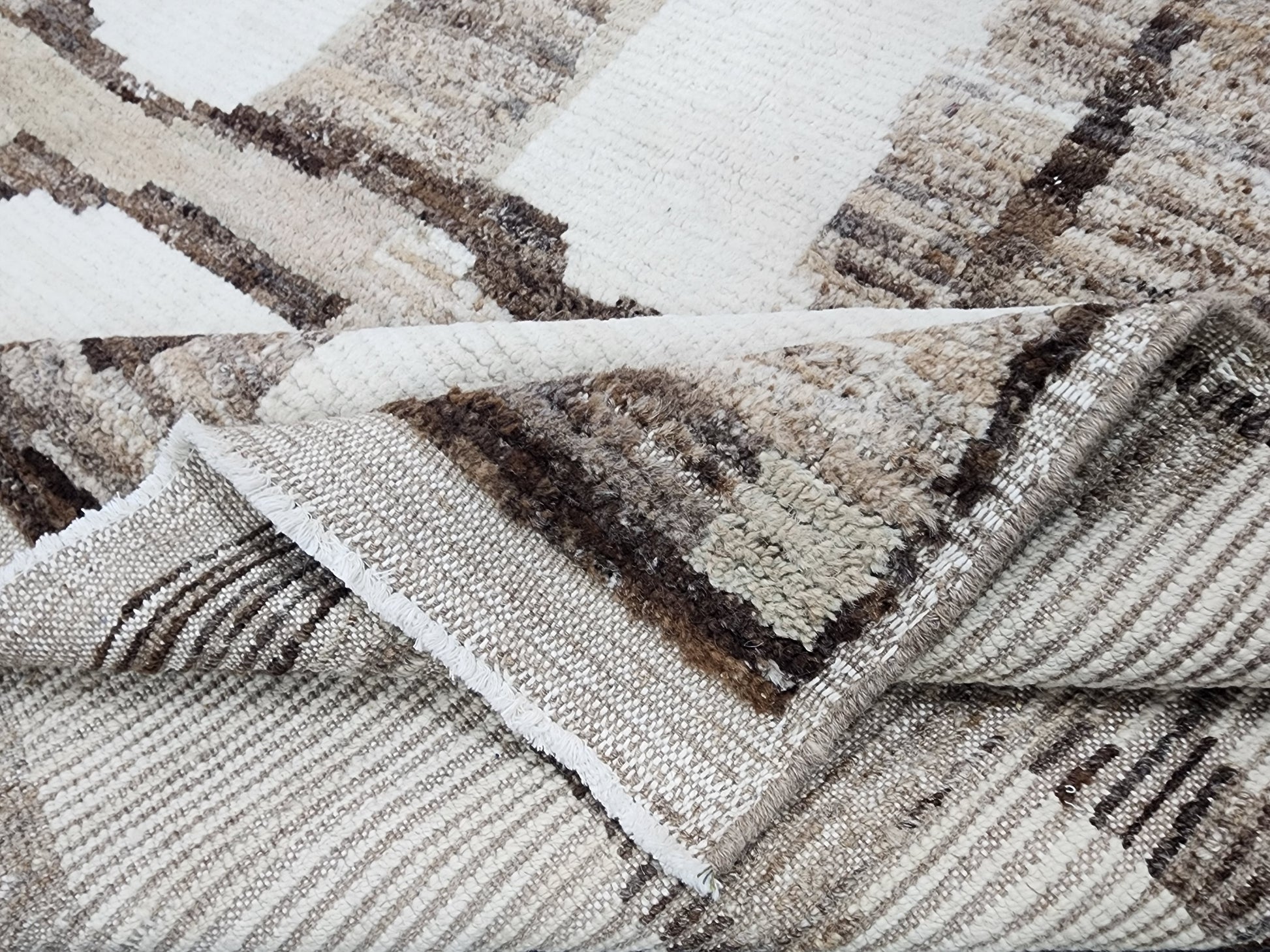 The irregular blocks and lines, reminiscent of urban grids or abstract art, give the rug a cutting-edge, artistic vibe while maintaining the warmth and authenticity of a handwoven piece. This rug is an ideal choice for modern living rooms, open floor plans, or loft spaces, serving as both a functional piece and a statement of art.